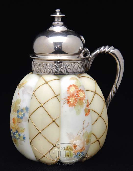 MT. WASHINGTON CROWN MILANO SYRUP PITCHER Melon ribbed glass with enamel decoration of flower blossoms and netting. Original silver plated spout and handle. Signed on underside with purple “CM” mark and “313”. SIZE: 5-1/2″ t. CONDITION: Very minor paint loss to gold netting in one area, otherwise good to excellent. 5-65053 (1,000-1,500)