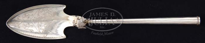 GORHAM STERLING FANCY SERVER. Fabulous handled serving piece has a tapered round handle with small bead decorated end. It is attached to a spear shaped bowl which has engraved design. At the top of the bowl where it meets the handle is a cast lion head in nice detail. It is marked “S & M Sterling 17” with Gorham hallmarks. No monogram. PROVENANCE: From a fine southern Maine home. WEIGHT: 3 tr. oz. SIZE: 12-1/4” l. CONDITION: Very good. 9-74399 SM (200-400)