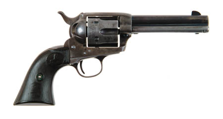*COLT 1ST GENERATION SINGLE ACTION ARMY REVOLVER. Cal. 32 WCF (32-20). SN 316111. Usual configuration with 4-3/4” bbl, 2-line address, and rampant Colt hard rubber grips. It is a scarce caliber in this bbl length. It has “Eleanor” and “1951” inside the left grip and “1951” inside the right grip. CONDITION: About good. Bbl retains 50-60% thin original blue, strong in the sheltered areas with heavy muzzle edge wear on the left side. Frame retains traces of case colors in the sheltered areas, being mostly a silver gray patina. Trigger guard retains traces of blue in sheltered areas, being mostly silver patina. Back strap is mostly dark brown patina. Cylinder has traces of blue in the flutes with the balance silver-gray patina with some moderate to heavy pitting in one spot. Two of the frame screws and one of the back strap screws are battered with three of the trigger guard screw appearing to be replacements. Grips are very worn with some battering on the right side, but still intact and turning chocolate. Mechanics are crisp, strong bright bore with scattered moderate pitting. 4-53068 JR611 (1,250-1,750)