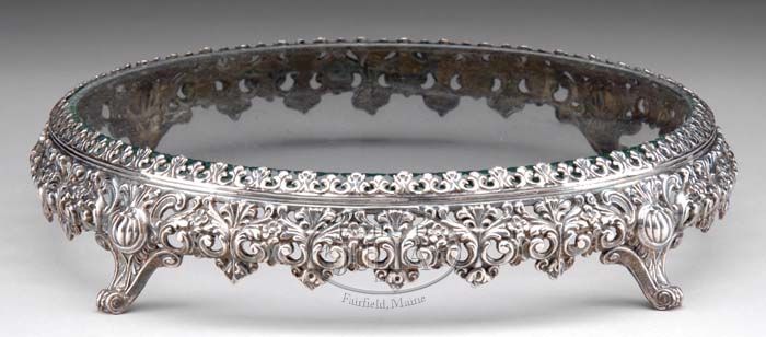 FINE VICTORIAN SILVER-PLATE AND BEVELED GLASS PLATEAU. The round beveled glass top with faceted edges fitted to the pierced, scrolled foliate base raised on four scrolled feet. SIZE: 13-3/4” dia. CONDITION: Overall very nice condition with minor surface scratches to glass top. 9-74785 SM (200-300)