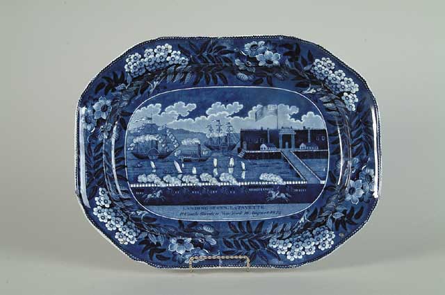 HISTORIC STAFFORDSHIRE PLATTER “THE LANDING OF GENERAL LAFAYETTE AT CASTLE GARDEN, NEW YORK, 16 AUGUST 1824”. Impressed “Clews” mark on base. SIZE: 17-1/4” x 13”. CONDITION: Very good, minor scratches on surface. 9-93593 (1,750-2,250)