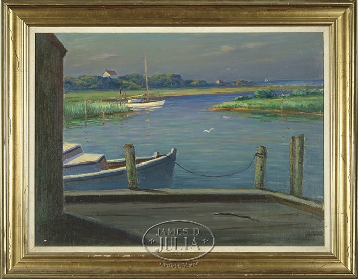 ELIOT CANDEE CLARK (American, 1883-1980) GWYNN’S ISLAND, VIRGINIA. Oil on board scene shows a low island with river inlet having a moored sailboat and a power boat alongside dock. A house is seen on bluff overlooking blue ocean with sailboat. Signed lower right “Eliot Clark”. Written on back in black “Gwinn’s Isle VA 54”. Housed in a good gilt frame with white liner. SIZE: 20” x 27”. CONDITION: Very good. 9-26431 (1200-1500)