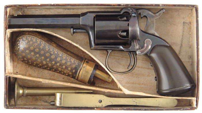 RARE REMINGTON BEALS 1ST MODEL 2ND ISSUE PERCUSSION REVOLVER WITH ORIGINAL BOX. Cal. 31. SN 67. Blued finish, German silver triggerguard, casehardened hammer, 3” oct bbl with two line Beals’ marking, &”REMINGTON S / ILION. N. Y.” on the top strap. 1-pc gutta percha bag grips, dovetail blade German silver front sight. This gun came from the estate of Maj. Gen. Henry L. Abbott. It was found in its orig cardboard box with orig supplied tools, flask & orig instruction sheet. Abbot was appointed Colonel of the 1st regiment Connecticut Heavy Artillery in 1863 and served through the end of the war, including the sieges at Petersburg & Richmond. He was appointed Brevet Major General after the Civil War in honor oh his “gallant meritorious service during the war”. It also contained a note in Abbott’s handwriting stating “Loaded – handle with discretion”. This note is included in the lot. This same revolver was pictured on the front cover of Gun Report, April 2001 (included in lot). Accompanied by orig 2-pc brown marbleized cardboard box compartmented for and containing a ball & star pistol flask typical to this pistol, loading tool, brass 2-ball bullet mold, cleaning rod & rarely seen nipple pick. The orig instruction sheet is also included. There is also a file of information about Maj. Gen. Abbott compiled by the consignor. CONDITION: Fine overall with 80% blue thinning on grip straps & mixed with spots of surface rust & flaking. 75% casehardening colors remain on hammer, worn on both sides at the bottom. Grip has minor scratches & chips at the bottom. Bore is good. Mechanically fine. Box is fine with minor scuffs on the corners. Accessories are also fine. 4-59449 JH67 (3,500-5,000)