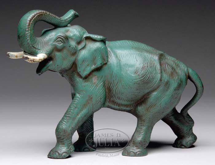 CAST IRON ELEPHANT DOORSTOP IN GREEN PAINT. Full bodied doorstop with upturned trunk. SIZE: 8” h. CONDITION: Some paint loss and rusting to legs and tusks, otherwise good. 9-90456 SM (150-350)