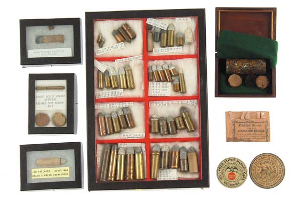 GOOD LOT OF MISCELLANEOUS EARLY AMMUNITION. This lot consists of 2 boxes and a display case of boxed and loose miscellaneous ammunition. The highlights are a paper-wrapped 58 musket round-fine; a 1” Gattling round – unfired, empty; a packet of 5 new police 36 cal. skin cartridges-fine sealed; packet of Frankford Arsenal 5-second fuse dated “1864”; full box UMC 45-70-500; 10 Maynard tape primers in excavated condition with 3 spare rolls – rusty tin, spare rolls fine; loose rounds consist of 50-70, 35 Maynard, 44 Russian and 50 pistol. There are 6 cap tins and 2 reproduction tins. A 52 Sharps Linen; a 6-pack of 44 skin cartridges; a 6-pack of 36 Navy skin cartridges made by Sage; a tube of Sharps pellet primers and 2 rolls of Maynard tape primers; 5 loose rounds of 44 Henry; full box Winchester 32 RF short with green label and red band; a 50 Gallagher brass and paper cartridge; a full box of Winchester 32 SW red label, red band – sealed. The display case contains pinfire, Teat Fire and cup-fire ammunition, two 44 Thuer cartridges a variety of common center fire and rim fires; four 50 cal. center fire and rim fire pistol cartridges; a 50 carbine cartridge; 45-70 & 50-70 cartridges; a Burnside; a 50 cal. Maynard, 2 Spencer and a Smith carbine cartridge. CONDITION: All appears to be in fine clean condition, some with oxidized lead. 4-49529 JR432 (500-1,000)