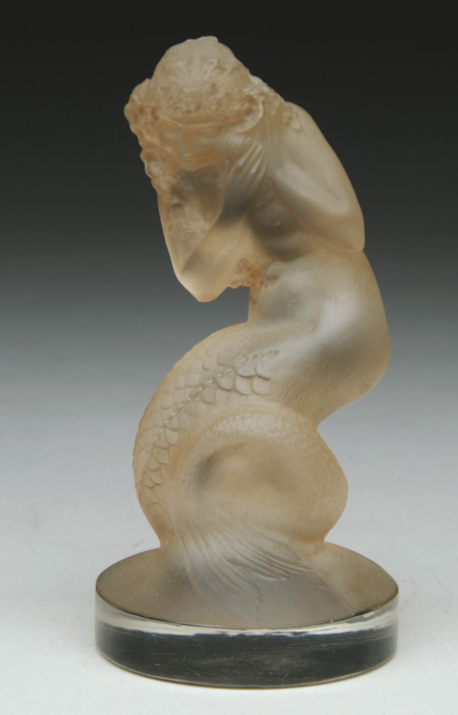 LALIQUE MERMAID MASCOT. Wonderful Lalique mascot depicting a mermaid (Naiade). Mermaid is finished with light brown patination. Signed on the underside with etched script signature “R. Lalique France”. SIZE: 5-1/4″ t. CONDITION: Very good to excellent. 5-62435 (5,000-6,000)