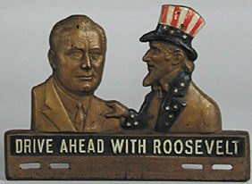 CAR BUMPER ORNAMENT. Die-cut molded composition with gold, red, white and dark blue paint. “Drive Ahead With Roosevelt”. Manufactured by ARPO. Copyright 1936 by Nationwide Distributors, New York. SIZE: 8″ x 11 1/4″. CONDITION: Nail holes, crack at Sam’s hat, some paint loss. 1-26795 (200-300) Auction: Advertising, Toy & Doll - Fall 2001 Please Note: All prices include the hammer price plus the buyer’s premium, which is paid by the buyer as part of the purchase price. The prices noted here after the auction are considered unofficial and do not become official until after the 46th day. |