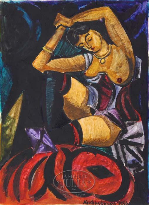 PETR PETROVICH KONCHALOVSKY (Russian, 1876-1956) POSE STUDY NO. 2. Unframed oil/gouache on paper laid on cardboard scene shows a woman in a red and bluish/portrait bustier with black and red stockings in a semi-nude pose with arms over her head. Colorful background having designs in red, blue, gold and green with black designs. Signed lower right in Cyrillic and dated “1956”. SIZE: 19-3/4” x 14-1/2”. CONDITION: Very good with a minor surface fleck in red area. 9-90393 HP (10,000-15,000)