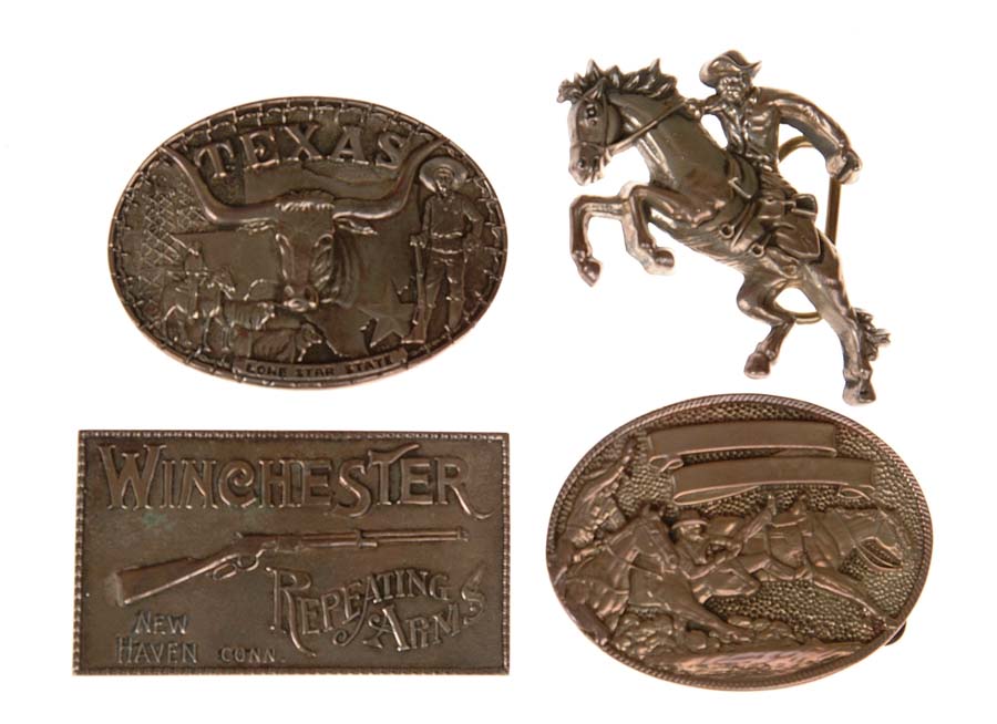 LOT OF NINE STERLING SILVER BELT BUCKLES. This lot consists of solid sterling silver buckles as follows: Three Texas Lone Star State buckles that weigh 5.46 to 5.85 Troy Ounces each; one Rodeo Bulldogger that weights 5.8 Troy Ounces; two large Winchester square buckles that weight 6.475 & 7.3 Troy Ounces; two Bronco Buster buckles that weigh 4.67 & 4.72 Troy Ounces each and one small Winchester buckle that weighs 2.21 Troy Ounces. Total weight is 48.165 Troy Ounces of .925 silver. CONDITION: All are new and unused. From the collection of the late Bruce McDowell. 4-54659 JR238 (350-700)