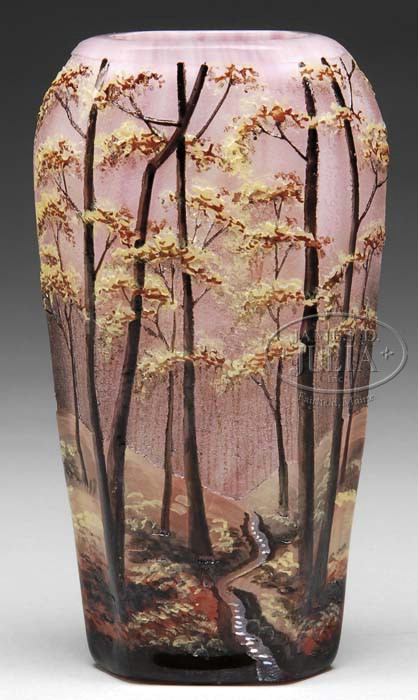 LAMARTINE CAMEO VASE. Exceptional autumnal scene of deciduous trees with remnants of yellow and brown leaves with ground foliage in colors of yellow, green, russet and brown are all set against a pink striated background. Signed “Lamartine” in script to side of vase and numbered on bottom “327/621”. SIZE: 6-1/2″ t. CONDITION: Very good to excellent. Minor open bubbles to vase. 5-61883 (600-900)