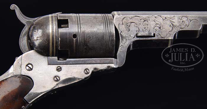 Please Note: Capper top is non-antique replacement. Bottom is correct. EXTREMELY RARE CASED ENGRAVED SILVER PLATED & INLAID COLT NO. 5 BELT MODEL TEXAS PATERSON PERCUSSION REVOLVER. SN 351. Cal. 36. Bore actually measures .415″. Spectacular Texas Paterson with 7-5/8″ oct bbl, tiny German silver front sight with usual Patent Arms address. It has a silver plated frame, front & back straps. The bbl, cylinder, cylinder plate & recoil shields are blued with case colored hammer. Recoil shields, hammer & sides of bbl lug are very nicely engraved in very early vine style foliate arabesque patterns with sparse coverage. Bbl has five silver bands with a band around muzzle, a wide & narrow band at cylinder end, another wide & narrow band on the bottom flats with a sixth silver inlay being a band just behind the front sight. Recoil shields also have a wide & narrow silver band inlay for a total of eight silver bands. Mounted with a highly figured, deluxe burl, 1-pc walnut grip with wide flared butt and rounded bottom edges. Cylinder has five chambers with square rear shoulder and is rolled with the stagecoach holdup scene. Accompanied by an orig Paterson mahogany casing with fluted lid and a rectangular German silver plate centered in the top with a silver plated escutcheon on front. Interior is lined in dark velvet with recesses in the bottom for the revolver, an orig #5 size charger with the number “55” on the powder end and “100” on the ball end. Center band is roll marked identically to the bbl address. Brass fittings on charger are all gold washed. Also accompanied by an orig Paterson capper numbered “201” on the inside, a reproduction sgl cavity, 3-handle ball bullet mold, an orig combination loading tool, nipple wrench and nipple pick and finally a walnut handled brass cleaning rod. Right rear corner is recessed for a spare cylinder and contains an orig No. 5 Paterson cylinder with serial number “113”. The serial number was observed on the rear face of bbl lug, wedge, rear face of cylinder, on cylinder rotating ring, on bottom of cylinder plate, left side of front and rear grip straps under grip. While no number was observed on the grip, it is readily apparent that these grips are orig to this revolver. No further disassembly was affected to determine additional numbered parts. According to The Book of Colt Firearms, Wilson, only about 1,000 of these rare revolvers were made in the period 1838-1840. Few survive today and those very few were cased and of those, only a very tiny number were engraved, making this truly one of the more rare Colts today. PROVENANCE: Dr. Joseph A. Murphy Collection. CONDITION: Very fine to extremely fine. Bbl retains 75-80% thin orig glossy blue with the loss areas a medium patina. Frame & front strap retain most of their orig silver plating with a few light nicks & scratches and a series of small nicks on left side. Front strap apparently was drilled & tapped at one time to attach a flat hammer spring to replace the orig “V” spring. That hole has now been plugged and the “V” spring stud & spring restored. There are light file marks on front strap. Back strap retains virtually all of its orig silver plating with some light battering on butt strap. Cylinder retains a silvery blue/brown patina and exhibits about 90% stagecoach holdup scene. Hammer has a chipped nose. Grip is sound, having been re-glued internally with light nicks & scratches and retains most of its orig varnish. Mechanics are fine, bright shiny bore with minor scuffing toward chamber end. Case has a couple of light cracks in the lid with another in the bottom, with minor handling & storage marks, nicks & scratches and retains most of its orig factory varnish. Interior is lightly faded with light soil. Charger overall retains about 90% strong orig finish. Capper is a medium mustard brass patina. Extra cylinder is a gray/brown patina. Combination tool retains 75-80% strong orig factory blue. Cleaning rod & bullet mold are fine. 4-36400 JR98 (350,000-650,000)