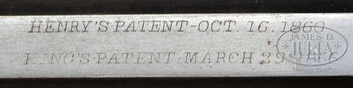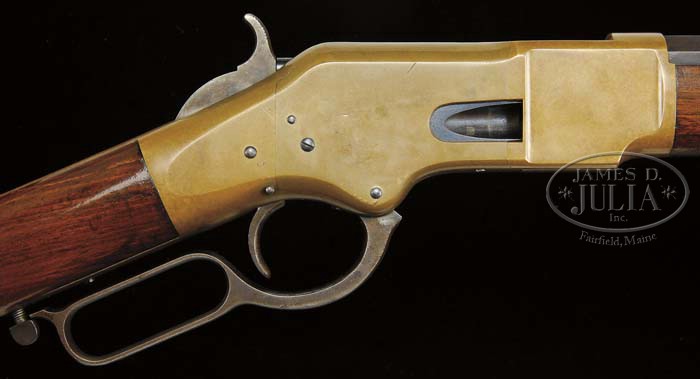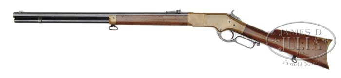 RARE EARLY “HENRY” MARKED WINCHESTER MODEL 1866 LEVER ACTION RIFLE. SN 26268. Cal. 44 RF Henry. Standard grade rifle with 24-1/4″ oct bbl, full magazine, half nickel front sight and 900 yard Henry ladder rear sight. Top flat of bbl has both Henry’s & King’s Patent markings. Forend cap is the early style brass with dimpled front edges. Mounted with uncheckered straight grain American walnut with straight stock and crescent brass buttplate with trap which contains a 4-pc brass & iron orig cleaning rod. Buttstock is stamped with the last four digits of matching SN in top tang channel with matching number inside toe of buttplate. Bottom of stock & forend cap have factory sling swivels. Left side of buttstock has the hand scratched Roman numeral “XIX”. Early “Henry”marked ’66s are seldom encountered with high orig finish because, immediately upon their introduction, they were purchased & used on the American frontier, usually under very harsh conditions with little or no maintenance. Just finding a “Henry” marked ’66 is a rarity but finding one with substantial orig finish is a very great rarity. PROVENANCE: Wes Adams Estate Collection. CONDITION: Very fine plus. Bbl retains about 95% strong orig blue with light muzzle & sharp edge wear, a few small chemical spots and some thinning over chamber area; magazine tube retains about 98% strong orig blue with the magazine band mostly gray patina; receiver retains sharp edges showing only very light wear around carry point on the bottom and all the brass retains a wonderful dark mustard patina; hammer retains strong case colors; lever retains faded case colors on sides, turned dark on outer faces; stock has a gouge on left side with normal nicks, scratches & dings and retains about all of its orig varnish finish; forearm is also sound and retains about 92-93% strong orig varnish with a couple of small gouges toward the upper end & wear on the bottom at the carry point. Hammer is solid in the full cock notch when manually cocked or when the lever is operated slowly, however if the lever is operated rapidly the hammer will not hold at full cock and will follow the bolt forward, otherwise mechanics are crisp, brilliant shiny bore; appears to be unfired with the bolt face retaining about all of its orig factory finish with crisp firing pins. 4-44556 JR448 (15,000-25,000)