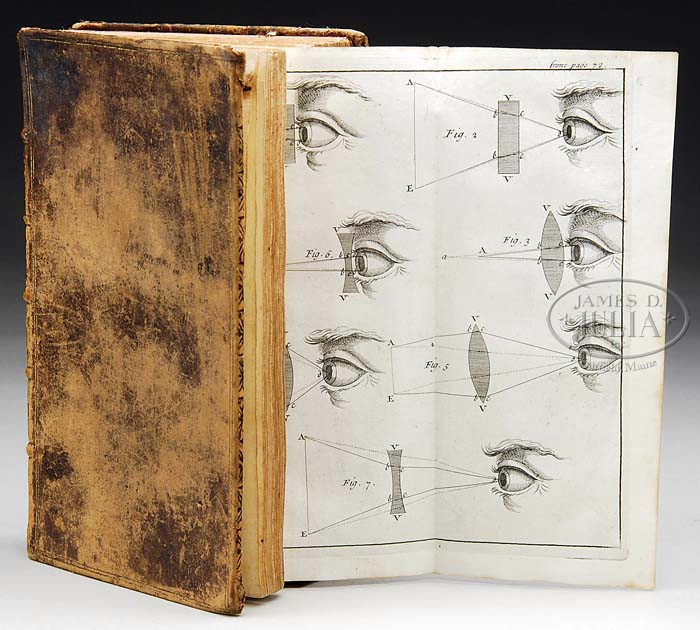 SIGNED BY TOBIAS LEAR. SMITH, ADAM AN INQUIRY INTO THE NATURE AND CAUSES OF THE WEALTH OF NATIONS. Basil: Decker, 1801. Four volumes. Bound in full polished calf with red spine labels. Some hinges starting, some scruffing, but should polish quite nicely. This edition based on the fourth London. To each title page: “Tobias Lear, July 12th 1803”. Each volume with the book plate of Benjamin Lincoln Lear. WITH: Graveside, William James. MATHEMATICAL ELEMENTS OF NATURAL PHILOSOPHY. LONDON; SENEX, 1731. Vol II only of the fourth edition. With the signature of Tobias Lear and the date 1785 to the title page. Missing the front free fly leaf. Many folding tables, bright and fine. Small 8vo full polished calf, crown chipped, tight and sound but a bit rough. Benjamin Lincoln Lear bookplate. WITH: A rough copy of ERASMUS’ SELECT COLLOQUIES. Published in London, 1766. In Latin and English. Laid in: “this book presented to Tobias Lear by Geo Washington (documented)”. Signed by Tobias Lear on the rear free fly and dated 1733. With Volumes III and IV (of four) of THE NAVAL HISTORY OF GREAT BRITAIN. London: 1758. Folding map of Africa by Kitchin (foxed, small tear). The map of North America with heavy damage. 12mo, full leather, crowns and spines chipped. WITH: THE ELEMENTS OF CRITICISM (Volume II only). A rough copy, signed twice by Tobias Lear. WITH: Tooke, W. HISTORY OF RUSSIA. London: Strahan 1800. Two volumes, 8vo, full leather in difficult condition with the front board of Volume I almost detached. All four plates present. The folding map foxed, but complete without major tears. The Smith, Tooke, and Erasmus titles cited in the list of “Catalogue of Books received from Washington” found in this estate and sold as Lot 2135. With the exception of the ELEMENTS OF CRITICISM, ALL WITH THE BOOKPLATE OF BENJAMIN LINCOLN LEAR TO EACH VOLUME. CONDITION: Very good. 9-97990 (1,000-1,500)