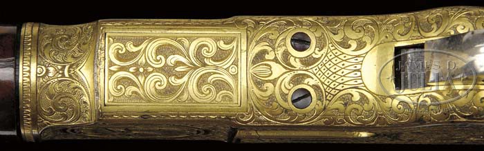 EXTRAORDINARY, ONE OF A KIND, RELIEF ENGRAVED, GOLD & NICKEL WINCHESTER MODEL 1866 LEVER ACTION RIFLE. SN 96741. Cal. 44 RF Henry. Spectacular rifle, gold & nickel finish with 24-1/4″ oct bbl, full magazine, gold washed Beech’s combination front sight and a reproduction Henry 900 yard ladder rear sight. Mounted with spectacular center crotch, flame grain, uncheckered American walnut with straight stock and gold plated brass crescent buttplate with trap containing an orig 4-pc brass & steel cleaning rod. Left side of lower tang, under the wood, is stamped “XXX” and a “V”. SN is in an engraved rectangle on the outer face of lower tang, inside the top tang channel of the buttstock and inside toe of buttplate. Receiver & forend cap have full coverage engraving, probably by John Ulrich which consists of ten large & small game scene vignettes all in semi-relief. The left sideplate is engraved with the large oval vignette of a standing hunter in a forest scene shooting two bull elk. To the rear of this large vignette are smaller vignettes of a standing bird dog, a partridge and below the large vignette is a tiny panel of a bear’s head. Forward of the large vignette is a small squirrel holding a nut and in the left front side panel is the rnd vignette of two feeding doe deer. Right sideplate is engraved with the large vignette of a standing bull elk, a reclining hind and a feeding fawn. To the rear are two smaller vignettes of a cougar and flying duck. In the right front side panel is the large rnd vignette of Diana the Huntress and her leaping hound. The remainder of the receiver has full coverage, intertwined foliate arabesque patterns with extremely fine punch dot background. The various scenes & panels are divided with counterpoint bright borders and decorative engraved borders. Forend cap has full coverage foliate arabesque patterns with a fine scalloped border around rear edge. Forend cap has a factory sling swivel with corresponding swivel in buttstock. The buttplate tang is engraved with matching foliate arabesque patterns surrounding a bright round counterpoint panel with decorative borders around the front edge. The bbl, magazine tube, lever, hammer & loading gate are nickel plated. Close examination of the receiver and tangs of this rifle disclosed no engraver’s signature. This rifle was discovered several years ago by well-known dealer/collector, LeRoy Merz in Spain. He personally traveled to Spain and purchased it from the great-great grandson of the former King of Spain. The family history of this rifle was that it was presented personally to the king by Oliver Winchester. Mr. Merz also purchased two other firearms from this direct descendant of the King of Spain, one being a Winchester Model 1873, SN 13, which was sold through the Julia Auction Company recently and a Colt Lightning Magazine rifle. It is almost without question that this rifle was created for a special presentation and given the elaborate and extensive engraving coverage, it certainly is of the quality one would expect for a royalty presentation. PROVENANCE: LeRoy Merz; Wes Adams Estate Collection. CONDITION: Extremely fine, all matching. Bbl retains 94-95% orig nickel with some flaked losses and fine freckling; magazine tube retains 96-97% restored nickel finish; receiver retains most of its bright orig gold wash with some light wear on right rear and right front sides of receiver; forend cap & buttplate retain virtually all of their orig factory gold wash; lever & hammer retain most of their orig nickel finish with a few small spots of flaking; wood is sound with numerous small nicks & scratches in the varnish and overall retains virtually all of its orig factory piano varnish finish; toe screw of buttplate is rusted which has stained the buttplate, but may clean; buttstock swivel is also lightly rusted; cleaning rod appears to be new & unused. 4-44554 JR299 (200,000-300,000)