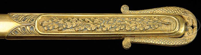 HIGH GRADE MEXICAN WAR “CITY OF PHILADELPHIA” PRESENTATION SWORD TO BREVET CAPT. BENJAMIN FRANKLIN HARLEY, 11TH US INFANTRY. This early high grade W.H. Horstmann presentation sword has oct sheet silver grip with military decorations on each panel. Pommel is a florally decorated urn terminating in large amethyst colored stone. The large cruciform “bow tie” shaped crossguard has four American eagles at terminal ends on both sides. The languet has a state seal of the city of Philadelphia in raised relief opposite of presentation in opposite languet which reads “Brevet Captn Benjn Franklin Harley of the 11th Infantry USA”. The scabbard has a 5-1/2″ panel with presentation in six lines which reads “Presented to Brevet Capt. Benjamin Franklin Harley of Philadelphia by his fellow citizens, for the promptness shown by him in the offer of his services to his country and for his gallant conduct in the battles of Contreras, Churubusco, and particularly at Molino del Rey at the capture of Chepultepec, the Garita San Cosme, and the final capture of the city of Mexico. Philadelphia Octr. 26th 1848”. This presentation is enclosed in beautiful “engraved frame” consisting of grapes, grape vine and leaves. Lower on scabbard is a 10″ engraved panel of more grapes and grape leaves surmounted by an American eagle on a patriotic shield below 13 stars. Scabbard mounts have raised relief decorations with laurel and star decorations as can be seen in photos. The blade of the drag is most unusual with the union of two sea serpents mouth to mouth which form a stylized smiling face when looked at from a distance. This is a wonderful historic sword in unique form among the earliest W. H. Horstman presentation swords known in the highest grade. PROVENANCE: Kevin Hoffman Collection. CONDITION: Brass scabbard, hilt and pommel retain 95% of there orig gold wash. Silver engraved grip and silver city of Philadelphia plaque exhibit good silver patina. Silver plaque is a bit loose at top but complete and sound. 33″ blade is gray/white with some areas of orig finish. 16″ etched panels are complete and discernible with scattered staining and pitting. 4-46906 JS95 (35,000-55,000)