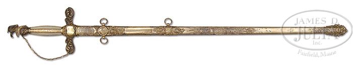 SPECTACULAR GOLD AND SILVER MEXICAN WAR AMES PRESENTATION SWORD TO CAPTAIN LEWIS MORRIS, KILLED IN ACTION AT BATTLE OF MONTEREY. This high grade Ames presentation is described by John Thillmann “This sword … has a sterling silver scabbard and hilt. Scabbard body is plated in gold as is the Phrygian helmet pommel surmounted by an eagle and foliated guard. In addition, the Mother of Pearl grip is inlaid with engraved gold strips lengthwise. Of note, is that the drag is in a unique form. It, too, is silver and gilt but exhibits a rarely seen elaborately cast drag crescent that almost flows into the scabbard body because of the fine engraving.” The gold presentation plaque, which measures over 3″, is finely engraved “Presented to Capt. Lewis N. Morris of the United States Army by his fellow citizens of Albany as a token of respect for his Bravery and Gallantry while in command of the 3rd Regiment U.S. Infantry in the battles of Palo Alto and Resaca De La Palma on the 8th and 9th of May 1846 and on the banks of the Rio Grande.” This scabbard is so richly engraved with floral and patriotic mounts that few examples show workmanship of same quality survive. There is a gold applied five pointed star in drag and engraved on central gold band in grip. These stars were possibly a reference to Texas as the presentation ends “on the banks of the Rio Grande”. This sword was ordered from Ames in June 1846 at a cost of $150. This was only the second sword shown in the Ames order book for Mexican War presentation, just after the sword of General Zachary Taylor which was ordered the same month. Captain Lewis Morris graduated from West Point in 1820 and was one of 11 West Point officers killed the same day, September 21, 1846, in the bloody battle at Monterey, Mexico lead by General Zachary Taylor. Lewis Morris was from a long line of military and political heroes. His father had signed the Declaration of Independence and his son would go on to be a Civil War hero to be killed at the battle of Cold Harbor in June 1864. This sword is in fabulous “as found” condition and of highest quality and artistry of the sword maker. PROVENANCE: Pictured in John Tillmann “Civil War Army Swords” page 467 and 468, also pictured in Kevin Hoffmann “Swords of Honor and Regulation”, Kevin Hoffman Collection. CONDITION: Sword is in very good to fine condition. 31-1/2″ double edged blade is bright/white, retaining most of its orig luster and finish with scattered areas of staining. 15″ etched panels retain most of their luster, as can be seen in photos. The silver hilt and scabbard retain much of their orig gold wash though thinning in areas. Engraved gold bands and gold plaque are fine with good detail. Mother of Pearl slabs in grip are fine and complete. 4-46905 JS70 (40,000-60,000)