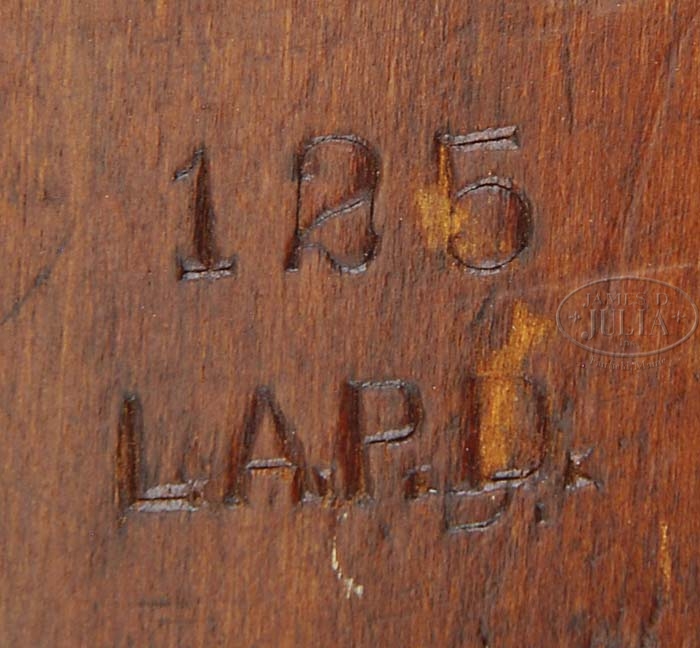 *WINCHESTER MODEL 94 CARBINE LAPD MARKED. SN 805562. Cal. 30 WCF. 20″ rnd bbl, full mag, square base with pin tall blade front sight, standard ladder carbine rear sight. Left side of bbl marked “MANUFACTURED BY THE WINCHESTER REPEATING CO./NEW HAVEN.CONN.U.S.A. PATENTED AUGUST 21.1894.” Left side below rear sight “NICKEL STEEL BARREL/ESPECIALLY FOR SMOKELESS POWDER 30W.C.F.” Standard receiver, left side with stud and saddle ring, two extra holes for receiver sight, right side is stamped “LAPD”. Mounted with straight grain gumwood stock, straight grip, steel carbine buttplate, left side near buttplate is stamped “125/L.A.P.D.” 9-1/4″ forend with bbl band. PROVENANCE: Ted Knee Collection. CONDITION: Very good. Bbl and mag tube retain 90% factory blue, slightly thinning and typical nicks, dings & scratches. Receiver has orig blue with numerous light scratching blending with brown & silver patina. Gumwood stock is sound with numerous nicks & dings and light scratches but carried much of its orig finsih blending with hand worn patina in grip area. Forend is sound with numerous nicks, dings & small gouges and retains some orig finish blending with hand worn patina. Mechanics are crisp with good bore with slightly dark grooves. 4-36530 BDT189 (1,500-2,500)
