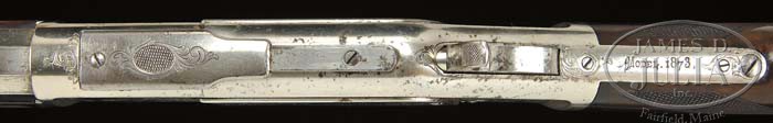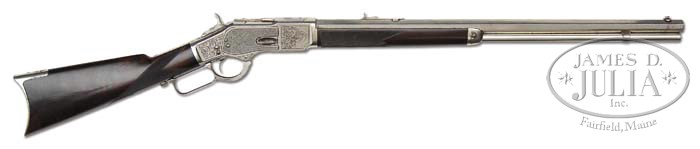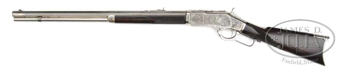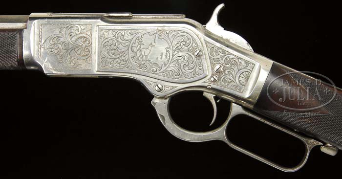 RARE DELUXE FACTORY ENGRAVED FULL NICKEL WINCHESTER 2ND MODEL 1873 LEVER ACTION RIFLE. SN 35027. Cal. 44 wcf (44-40). Wonderful early ’73 with 24-1/4″ oct bbl, full magazine, thinned Lyman front sight and short semi-buckhorn rear sight with checkered edges. Receiver has attached dust cover rail with impressed, checkered thumbprint dust cover and sgl set trigger. Mounted with very nicely figured, 2X American walnut with early style checkered forearm and straight stock with crescent buttplate with trap. Left side of lower tang, under the wood, is stamped with assembly number “84” and “XX”. Matching assembly number is also found in top tang channel of buttstock and inside toe of buttplate. Receiver is beautifully engraved by L.D. Nimschke with the vignette of a bull & cow elk on left side plate all surrounded by foliate arabesque patterns. Right sideplate and sides of receiver are engraved with matching foliate arabesque patterns and a large shell pattern on side plate. Top & bottom of receiver, top tang & buttplate tang are engraved to match with matching patterns on forend cap. Accompanied by two Cody Firearms Museum letters, one dated 1995 and the other 2001. Both identify the rifle with oct bbl, set trigger, checkered stock, full nickel and $2.50 engraving, received in warehouse June 9, 1879 and shipped June 12, 1879 to Order #15529. The 1995 letter also states that it was shipped with three other arms. PROVENANCE: Wes Adams Estate Collection. CONDITION: Very fine, all matching. Bbl retains 93-95% strong orig nickel with some light flaking on left lower flat above the magazine tube and some light thinning over chamber area; magazine tube retains about all of its strong orig nickel plating; forend cap retains about 85-90% orig nickel; receiver retains 90-95% strong orig nickel with losses on right sideplate and the carrier being exposed brass and ; lever & hammer retain strong orig nickel with scattered flaking; buttplate retains about 80% orig nickel; wood is sound with a few light nicks & scratches and retains most of a fine, old professionally restored finish. Mechanics are fine, strong bore, dark in the grooves. 4-44569 JR4200 (20,000-30,000)