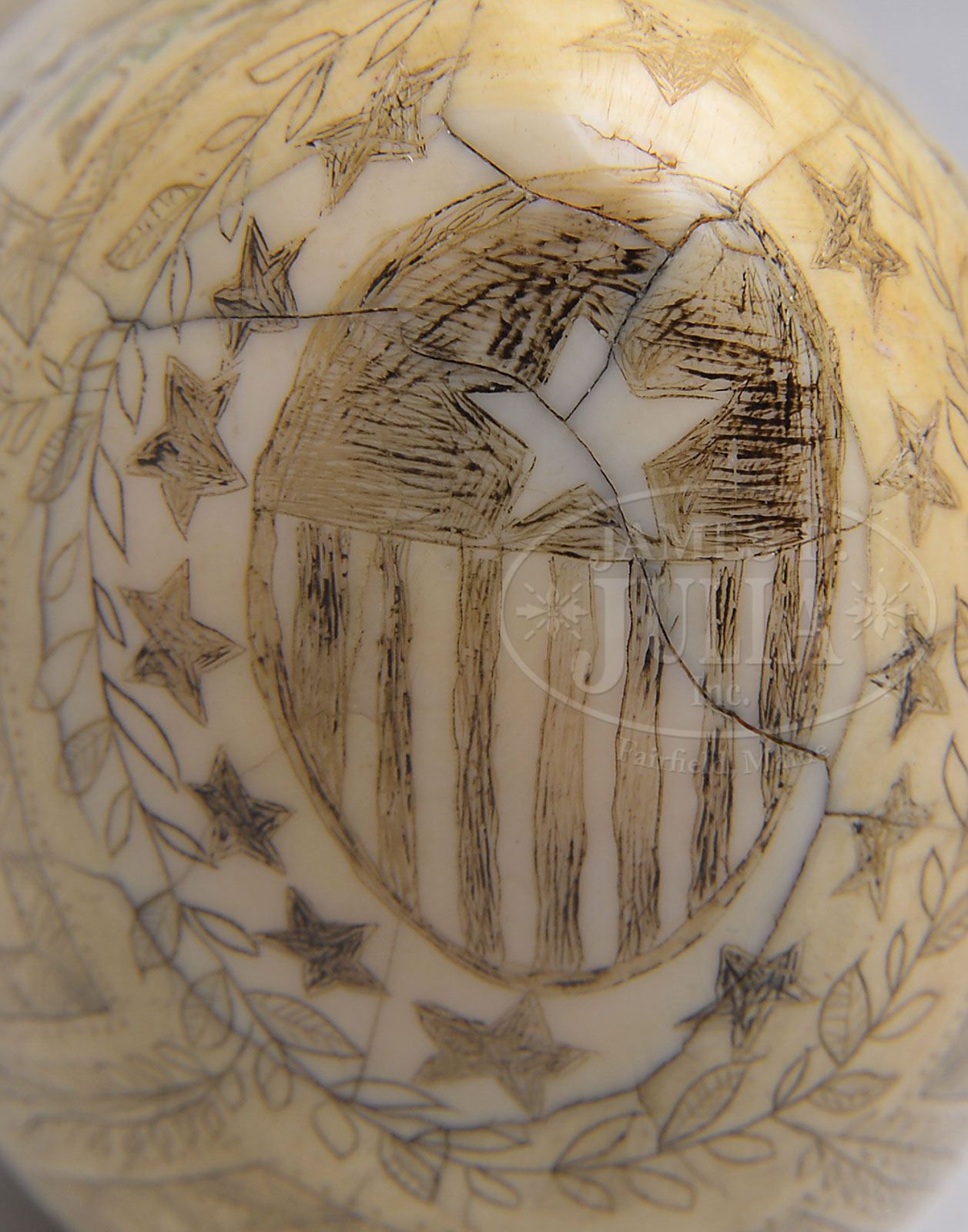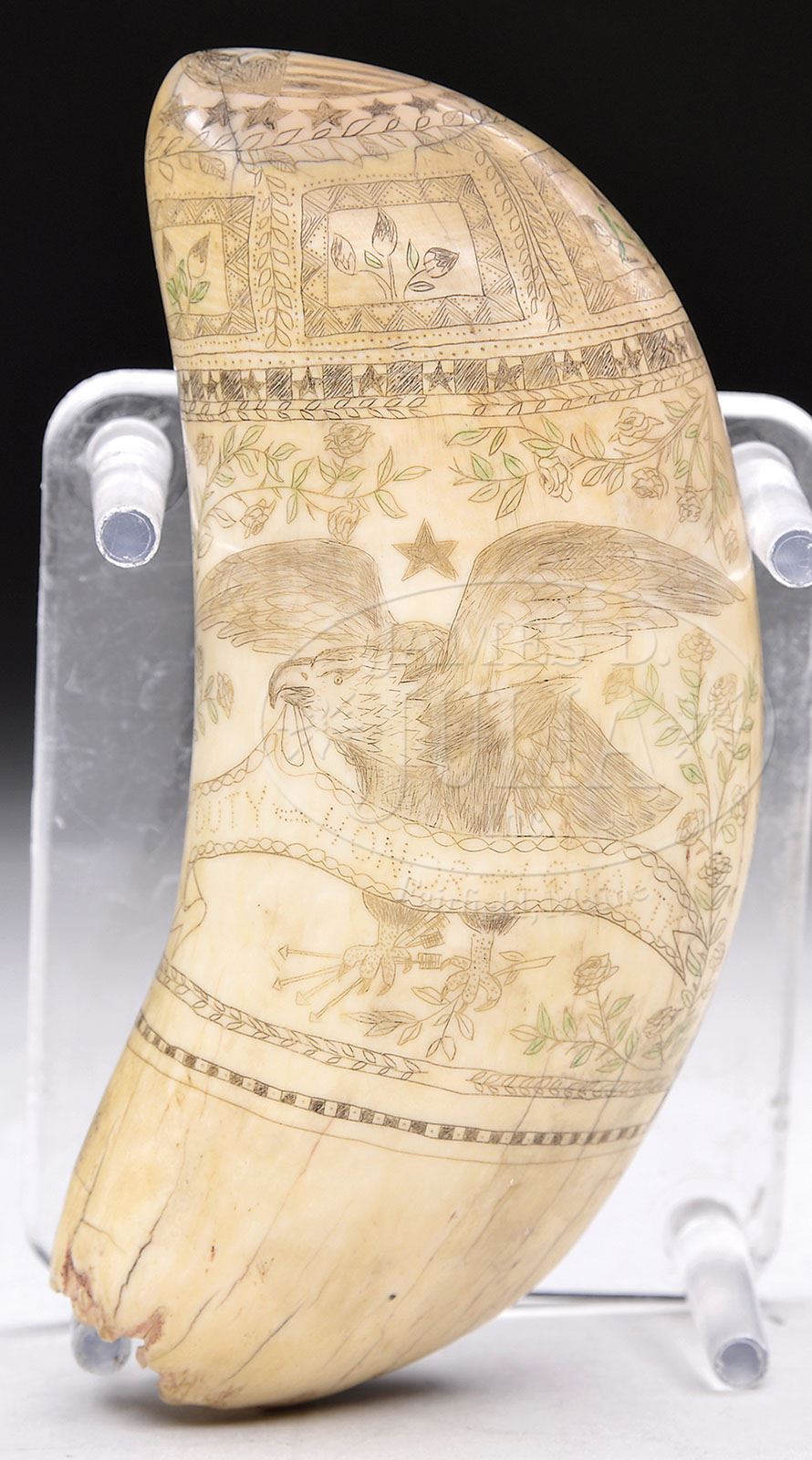 FINE SCRIMSHAW TOOTH. Early 20th century, New England. Scrimmed depicting a woman with bonnet and fan within polychrome floral spandrels. Further bordered with a band of stars, titled “BEAUTY”. The reverse depicting a splayed eagle, a banner in its mouth, inscribed “DUTY-HONOR-LOYALTY”. A clutch of arrows and sprig of olive branch in each talon, again within floral spandrels and star border. The point of the tooth surmounted by a patriotic shield within a border of stars and olive branches. SIZE: 7-1/2″ l. PROVENANCE: From a private Utah collection. CONDITION: Very good with nicely polished surfaces, mellow patina, and normal and expected shrinkage cracks to case of tooth. Otherwise very good. 9-90382 (1,000-1,500)