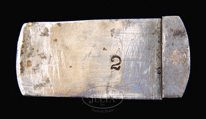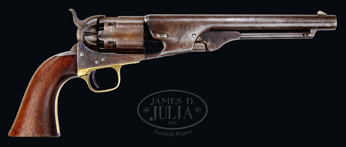 EXTREMELY RARE & UNIQUE PROTOTYPE/EXPERIMENTAL COLT MODEL 1860 ARMY PERCUSSION REVOLVER WITH FLUTED CYLINDER. SN 2. Cal. 44. Extremely rare & unique Army with 8″ rnd bbl, German silver front sight, no bbl address and very rare 3-pc 51 Navy style rammer with flat-sided pivot. Bbl lug is further unusual in that it has extremely shallow flutes on sides and therefore somewhat heavier than production models. Cylinder is fully fluted with serial number on back between two of nipples. There is a tiny “T” in web between two of chambers on face of cylinder. Rear of cylinder has holes for safety pins but it appears that none were ever installed. It has a standard 3-screw frame, not cut for shoulder stock and does not have “COLT’S PATENT” on left side. Right recoil shield has cutout with capping groove which usually does not appear until later production. It has an Army sized grip with brass trigger guard that has a 3/8″ extension at bottom edge & iron back strap with 1-pc walnut grip. Cylinder pin is not numbered. This exact revolver is pictured in full color on p. 156 and again in black & white as item #B on p. 158 in The Book of Colt Firearms, Wilson. Mr. Wilson states that “similar prototype arms are in the Wadsworth Atheneum, Connecticut State Library, and private collections. None of these has barrel markings.” PROVENANCE: Colt Factory Collection at Connecticut State Library; William Locke Collection; Robert Q. Sutherland Collection;Chas. Schreiner III Collection; Robert Berryman; Illustrated in The Book of Colt Firearms, pp. 156 & 158; Little John’s Auction, 9 Nov. 2003, Lot #61 CONDITION: Fine to very fine, all matching including wedge & rammer. Bbl retains traces of orig blue in very sheltered areas and faded case colors on rammer pivot. Cylinder is flaked to a silver/brown patina with traces of orig blue. Frame & hammer retain 75-80% orig case colors, strong & bright on left sides, more faded & turning gray on right sides. Trigger guard retains a medium mustard patina & back strap with traces of blue is mostly a blue/brown patina. Grip has a chipped right toe with other minor nicks and retains a hand worn patina. Mechanics are fine, very bright shiny bore with a spot or two of light pitting. 4-32331 JR359 (22,500-32,500)