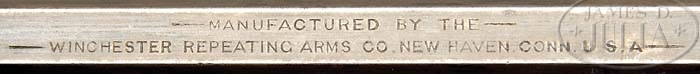RARE WINCHESTER MODEL 94 FIRST MODEL TAKE DOWN LEVER ACTION RIFLE. SN 4598. Cal. 38-55. 26″ oct bbl, full mag take down, fine ivory bead Lyman front sight, serrated side “V” notch sporting rear with set screw, usual bbl markings, first model receiver with external guide screws. Mounted with nicely figured straight grain walnut, straight grip, crescent steel buttplate, standard forend with nosecap. Accompanied by a Cody Firearms Museum Fact Sheet identifying this rifle as a 38-55 oct bbl rifle, plain trigger, take down, received in warehouse 6/10/1895 and shipped from warehouse 7/27/1895 on order no. 16431. CONDITION: Very good+. Bbl retains some orig blue blending with brown & silver patina, bright on sharp edges, and some normal minor nicks & dings. Mag tube has thinning orig blue blending with brown patina, bright from take down. The first model receiver has 65-70% thinning orig blue, blending with silver and brown patina and showing prominent orig polish marks. Loading gate shows good orig nitre blue. Hammer retains dark orig case colors, thinning on left side. Lever retains dark orig case colors in protected areas and blending with silver patina. Stock is sound with minor nicks, dings & scratches, shallow dent in comb, and shows orig finish blending with hand worn patina. Forend is sound with normal nicks, dings & scratches, shows traces of orig finish blending with an open grain hand worn finish. Mechanics are good with a slight sideways wiggle in bbl, good bore, lightly frosted. 4-39017 BDT355 (7,500-10,500)