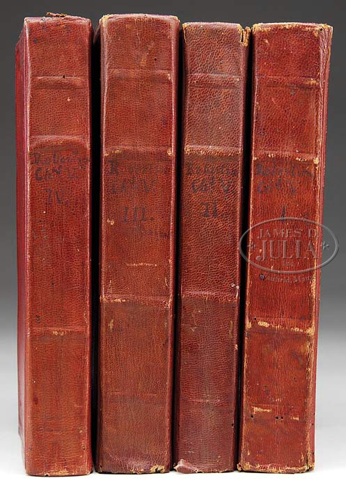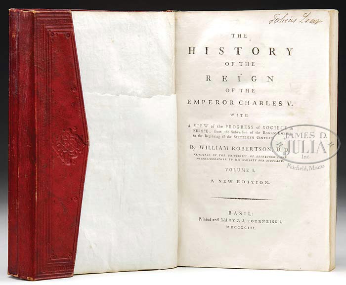 ROBERTSON, WILLIAM. THE HISTORY OF THE REIGN OF THE EMPEROR CHARLES V. Basil: Tourneisen, 1796. Complete in four volumes (bound as above), each WITH THE SIGNATURE OF TOBIAS LEAR. This work is cited on the list of “Catalogue of Books received from Washington” found in this estate and sold as Lot 135. WITH THE BOOKPLATE OF BENJAMIN LINCOLN LEAR TO EACH VOLUME.. These books were previously owned by Benjamin’s father, Tobias Lear, and these beautiful Morocco bindings were probably commissioned in Spain and done at the time Lear was Consulate for Algiers during the Barbary Wars. CONDITION: A very good set, upper third of second free fly missing. 97988 (1,000-1,250)