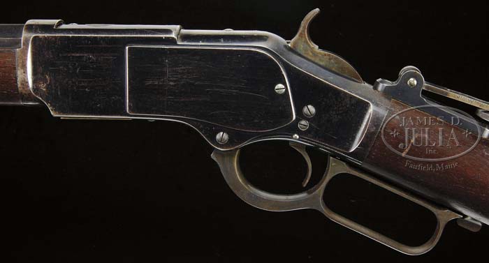 SCARCE SPECIAL ORDER WINCHESTER 1ST MODEL 1873 LEVER ACTION RIFLE. SN 29331. Cal.44 WCF (44-40). Standard grade rifle with 28″ oct bbl, half nickel front sight, short semi-buckhorn rear sight with checkered edges and a thick base tang sight with 4″ staff. Receiver has a mortised dust cover with impressed checkered thumbprint. Mounted with nicely figured, slab-sawed uncheckered American walnut with straight stock and crescent steel buttplate with trap. Left side of lower tang, under the wood, is stamped with assembly number “399” with matching assembly number in top tang channel of buttstock and inside toe of buttplate. Lever latch is the later style without threads. Accompanied by a Cody Firearms Museum letter identifying this rifle with 28″ oct bbl & plain trigger with no shipping information. 1st Model ’73s are scarce with special order features and given their early, immediate success with usually hard & continuous service on the American Frontier, today they are rarely found in orig configuration with high orig finish. PROVENANCE: Wes Adams Estate Collection. CONDITION: Very fine. Bbl retains 97-98% strong orig blue with only light sharp edge wear; magazine tube retains about 95% strong orig blue with fine pinpricks of surface discoloration and turning plum; receiver & sideplates retain 93-95% strong orig blue with some minor candy striping and cleaning scratches on sides, turning a little plum over receiver ring and bottom front, in the recess; hammer retains most of its orig case colors and the lever retains strong case colors on the sides, turned dark on outer faces; stock has a couple of minor chips and a few, very minor, scattered light nicks & scratches and retains most of its orig oil finish. Mechanics are crisp, brilliant shiny bore; shows little evidence of use retaining most of its orig factory blue on bolt face. 4-44588 JR422 (12,500-17,500)