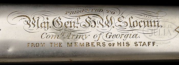 TIFFANY HIGH GRADE PRESENTATION SWORD TO MAJOR GENERAL HENRY SLOCUM. Henry Slocum was an important Union Civil War General. He originally had graduated from West Point 7th in his class in 1852. He stayed in the Army several years and then became an attorney in New York while remaining a Colonel in the New York Militia. At the outbreak of the Civil War Slocum became Colonel of the 27th New York Infantry. During the first battle at Bull Run Slocum led his men, he was wounded and his regiment suffered 130 casualties. Soon after, in August 1861, Slocum was appointed Brigadier General in command of a brigade. In October 1862 he was made Commander of the 12th Army Corps after its Commander Joseph Mansfield was killed at the battle of Antietam. Slocum was involved at the battles of Chancellorsville and later Gettysburg. After Gettysburg Slocum was transferred to the Western Theater. When General James McPherson was killed in Atlanta, General Sherman selected Slocum to command the newly formed 20th Army Corps made from remnants of his old 12th Corps and the 11th Corps. When Atlanta fell in September 1864 Slocum’s corps was the first to enter the city. The Army of Georgia was formed by combining Slocum’s 20th Army Corps and the 14th Corps and would now form the left wing of Sherman’s “March to the Sea” Army. Presentation of this sword probably dates late 1864 in Atlanta where Slocum was given the “Army of Georgia.” This General Officer’s sword by Tiffany & Company exhibited a fluted silver grip, silver chain and silver langette and gold etched blade. Scabbard with high relief and engraved mounts has engraved presentation which reads “PRESENTED TO MAJ. GENL. H.W. SLOCUM COM’D ARMY OF GEORGIA FROM THE MEMBERS OF HIS STAFF”. Swords to Major Generals who commanded entire armies are rare. This is a beautiful example. A file of provenance accompanies this sword. PROVENANCE: Pictured in John Thillmann “Civil War Army Swords” page 517 and 518, also pictured in Kevin Hoffmann “Swords of Honor and Regulation”, Kevin Hoffman Collection. CONDITION: 32″ double edged blade full firm marked “Tiffany & Co NY” has 17″ etched panels on either side with gold background. Blade overall is bright with scattered areas of staining and light pitting. Etched panels retain most of their orig luster and most of their orig gold background. Fluted silver grip, langette and chain are very good with gray/silver patina. Brass cruciform crossguard with pine cone finials and helmeted bust retain strong traces of orig gold wash with remainder yellow brass patina. German silver scabbard body and brass mounts retain about 30% orig gilt with remainder a dull silver patina with scattered small scratches, stains and dents. 4-46899 JS73 (60,000-80,000)