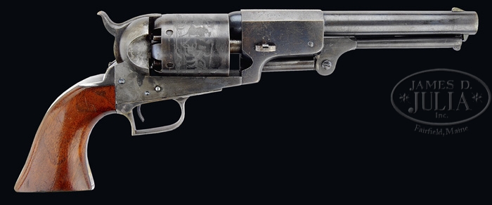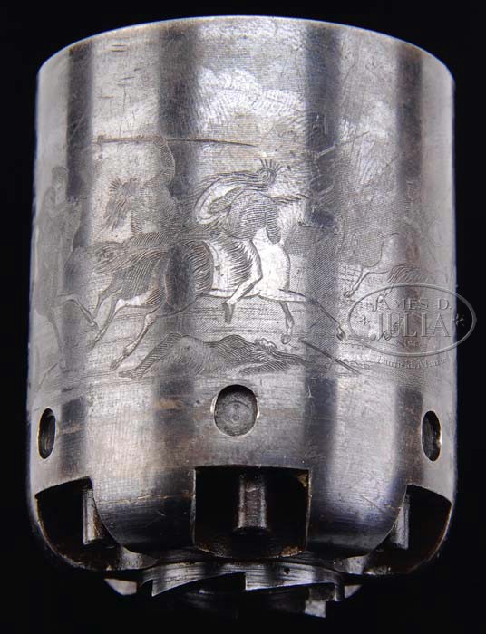 FABULOUS GEN. FRANKLIN PIERCE DOUBLE PRESENTATION CASED COLT 1ST MODEL DRAGOON PERCUSSION REVOLVER. SN 3969. Cal. 44. Wonderful 1st Model Dragoon with 7-1/2″ oct to rnd bbl, German silver front sight and address that reads chamber to muzzle. Rammer handle has the vertical latch. It has usual 6-shot cylinder with oval stop notches and the Ormsby Ranger/Indian fight scene. Frame is marked “COLT’S PATENT” over a tiny “U.S.”. Square back trigger guard and back strap are silver plated and contain a 1-pc walnut grip. Back strap is engraved in period script “Presented by Col Seymour, Gov. of Conn. to Genl / Franklin Pierce, & by him presented to Thos J. Whipple.” Accompanied by a very early brown leather covered casing with coffin top having incised line decorations with a gold embossed black leather rectangle in center inscribed in gold “COL. T.J. WHIPPLE.”. It has a mortised brass lock with ornate rococco brass escutcheon and is lined in burgundy velvet with recesses in bottom for revolver, an early Dragoon size flask, a brass 2-cavity mold with sprue cutter unusually marked on right side “COLTS PATENT” and a reproduction Paterson style U-shaped nipple wrench/screwdriver. Flask is dbl sided with a repoussed stand of flags & arms over crossed Paterson rifles which are over a crossed pair of Paterson revolvers and has a ribbon below embossed “COLTS PATENT”. It has hangers low on each side with triangle loops. One of hangers has been soldered in place. Cap on the top is also marked “COLTS PATENT”. Accompanied by an NRA Silver Medallion No. 378 awarded to this revolver as one of the ten best revolvers at an annual meeting. Franklin Pierce, 1804-1869, was from New Hampshire and a confirmed Democrat. His early life in New Hampshire was undistinguished even as an elected member of the U.S. House of Representatives and later the U.S. Senate until he enlisted for service as a Private in the Mexican War and was soon appointed Colonel. In March of 1847 he was appointed Brigadier General and took command of a brigade of reinforcements under the command of Gen. Winfield Scott marching to Mexico City. At the Battle of Contreras Gen. Pierce seriously injured his leg but the next day resumed command and fought in two more major battles and was with Gen. Scott at the capture of Mexico City. After the war he returned to New Hampshire and in 1853 became the 14th President of the United States. At the end of his term in 1857 he was not renominated by his party due to unpopular legislation he had promoted regarding the slavery issue in Kansas. He returned to New Hampshire and led a rather mundane and undistinguished life until is death in 1869. Col. Thomas Hart Seymour, 1807-1868, was also a confirmed Democrat from Connecticut where he was educated and served one term as a member of the U.S. Congress, 1843-1845. He declined renomination and in 1846 was commissioned a Major in the New England Regiment of Volunteers and served in the Mexican War. He fought with great distinction and bravery at the Battles of Melino & Chapultepec where he was accorded high military honors. During the assault up the steep slopes of Chapultepec, under murderous fire his Colonel was killed. He took command and continued the assault and capture of the fortified town. He fought through the remainder of the Mexican War and was with Gen. Scott at the capture of Mexico City. After the war he returned to Connecticut and in 1850 was elected Governor and was re-elected in 1851, 1852 & 1853. In April 1853 he was appointed Minister to the Russian Court by Pres. Franklin Pierce where he served four years. Both of these men were staunch Democrats and both were sympathetic to the Southern cause during the Civil War which, when discovered, led to their complete abandonment by the Democrat Party and general ostracizing by the public, so much so that Gov. Seymour’s portrait was, by vote of the Legislature, removed from the State House. Both died reasonably obscure. The above facts give credence to the connection between Gov. Seymour and Pres. Pierce. Thomas Jefferson Whipple was born in 1816 in New Hamshire and after receiving his education became a lawyer in New Hampshire. Sometime prior to 1840 he raised an independent military company, the Wentworth Phalanx, and was Aide-de-Campe to Gen. Cook when only seventeen years of age. He was later commissioned 1st Lieutenant in the 9th New England Regiment, became the Adjutant of Col. Pierce in the Spring of 1846. He fought in the Mexican War and was taken prisoner at Vera Cruz and subsequently exchanged at Jalapa. After the War he returned to New Hampshire where he remained, practicing law, until the outbreak of the Civil War. He served as Lt. Colonel of the 1st New Hampshire Regiment and then as Colonel of the 4th and later the 12th New Hampshire Regiments. He had been active in politics prior to the outbreak of the Civil War and then resumed his political connections after the Civil War. This information therefore ties Col. Whipple to Pres. Pierce having been Col. Pierce’s Adjutant during the Mexican War. As of this writing the actual reasons for the presentations are unknown. PROVENANCE: Dr. Joseph A. Murphy Collection. CONDITION: Extremely fine, all matching except wedge which is numbered “924” (grip was not checked). Bbl retains about 95% orig blue with light muzzle edge wear and flaking over bbl lug. Rammer & rammer handle retain dark case colors. Cylinder retains about 90% thin orig blue turning brown and also retains 96-98% Ranger/Indian fight scene. Frame & hammer retain dark case colors, smoky on right side, with brighter colors on right side of hammer. Trigger guard & back strap retain most of their orig silver plating with a couple of thin spots with brass showing through. Grip is sound with minor nicks & scratches and retains most of its orig varnish. Mechanics are crisp, bright shiny bore with scattered spots of pitting. Case has some minor cracks in th