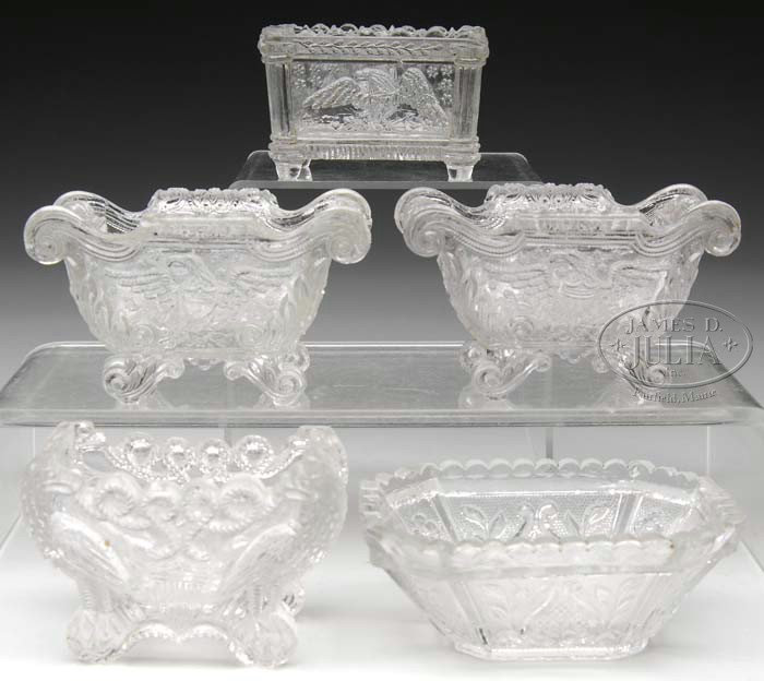 FIVE CLEAR LACY GLASS OPEN SALTS. Includes five eagle pattern lacy salts by the Boston & Sandwich Glass Company. 1) Neal EE1. Front and back with a splayed eagle, each side having a willow tree. CONDITION: Very good showing minor flakes around rim. 2) Neal EE3. Showing a perched eagle on each corner and an American shield on the front and back. CONDITION: Very good with minor flakes on the rim and the feet. 3) Neal EE6. With a splayed eagle in the stippled base. CONDITION: Good with noticeable chipping around rim. 4 & 5) Each are Neal EE7. Splayed American eagle on front and back. Neal rates these two as rare. CONDITION: Each are very good to excellent with only the most minor of flaking to feet. SIZE: 2″ t x 3″ w, 2-1/4″ x 3-1/4″ w, 1-1/2″ t x 3-3/4″ w and two 2-1/4″ t x 3-3/4″ w respectively. PROVENANCE: From the Collection of Dorothy-Lee Jones. CONDITION: As noted. 5-63147 (800-1,000)