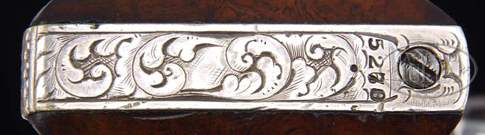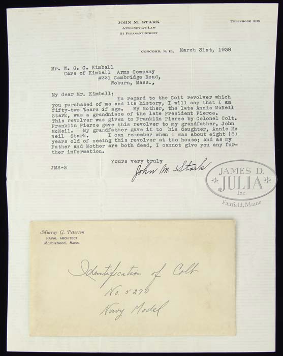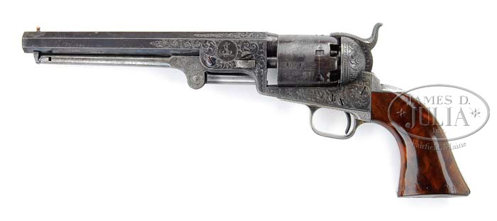 INCREDIBLY UNIQUE PRESIDENT FRANKLIN PIERCE FROM COL. COLT PRESENTATION CASED COLT MODEL 1851 NAVY PERCUSSION REVOLVER. SN 5270. Cal. 36. Spectacular, unique and well documented Colt Model 1851 Navy revolver with 7-1/2″ oct bbl, brass mushroom pin front sight and 1-line New York City address. Left side of the frame has hand engraved “COLTS PATENT” and it is fitted with silver plated small oval brass trigger guard & back strap with spectacular deluxe, varnished, burl walnut, flame grain 1-pc grip with the matching serial number in the back strap channel. Frame, bbl & bbl lug, rammer pivot, hammer, back strap & trigger guard are beautifully engraved in pattern known as “Large Donut Scroll” with full coverage on the frame and recoil shields. Recoil shields have a wide triple border. Right recoil shield has a capping cutout without groove. Bbl & bbl lug have matching large foliate arabesque patterns with a most unusual and rare panel vignette on the right side of a 3-masted sailing ship under full sail with another sailing ship in port in the background. Left side of bbl lug has a round vignette of a fouled anchor. Top two side flats of bbl have matching foliate arabesque patterns with incised border lines around the address on top flat terminating in a leaf pattern. Muzzle & chamber ends of the bbl have border patterns with an anchor chain pattern at the left rear edge of bbl lug. Hammer is deluxe engraved to match with wolf’s head on each side of hammer nose and a very fine hand-cut knurled spur. Back strap has matching deep engraved patterns at top & heel with the center a rectangular panel with scalloped borders bearing the inscription “TO GENL FRANK PIERCE / from COL. COLT”. Butt strap & trigger guard are engraved with matching patterns and trigger guard flat has feather pattern borders. Shoulders of back strap & trigger guard are also engraved to match and all screwheads are engraved except the rammer screw which is probably an old replacement. Cylinder is usual 6-shot configuration with rolled Ormsby Naval battle scene that may have been hand enhanced. Accompanied by its orig blue velvet lined mahogany casing with shield shaped lock escutcheon for the mortised brass lock. Bottom is compartmented for the revolver, a wonderful “COLTS PATENT” angle spout Navy sized flask, a brass 2-cavity bullet mold with fire blued “COLTS PATENT” sprue cutter, a sealed tin of Eley’s caps with mottled paper wrapping and green & black label, an L-shaped nipple wrench/screwdriver and a rarely encountered wood handled nipple pick, occasionally seen in high grade presentation sets. Also accompanied by an NRA Silver Medallion, #100, which was awarded to this revolver on March 30, 1969 at the 98th Annual Meeting of the National Rifle Association in Washington, DC. The owner at that time was renowned firearms authority, Eric Vaule. Also accompanied by an American Society of Arms Collectors Medallion awarded to this wonderful Colt at the September 2008 meeting in Williamsburg, Virginia. Additionally accompanying is a Franklin Pierce Presidential pin-back which is a 2-1/8″ diameter button with the picture of General/President Franklin Pierce. Additionally accompanying is a large bronze rampant Colt statue awarded to this revolver at an annual Colt Society meeting & exhibit. Another accompaniment is a William Rogers sterling teaspoon with an embossed likeness of Franklin Pierce and his name on the handle with the inscription on a ribbon below his protrait “14th President 1853-1857”. Also accompanying is a modern made 31-star American flag commemorating the number of states in the Union when Franklin Pierce became President. And finally accompanying is a large binder of material on the life of Franklin Pierce, Congressman, U.S. Senator, Brigadier General of New Hampshire Volunteers in the Mexican War and 14th President of the United States (1804-1869). Franklin Pierce was born in 1804 in Hillsboro, New Hampshire, educated in New Hampshire and Bowdoin College in Maine where he formed a lifelong friendship with Nathaniel Hawthorne. Upon graduation in 1824 he studied law and was admitted to the Bar in 1827. He was a lifelong Democrat and became a member of the New Hampshire House of Representatives in 1829 and was elected Speaker in 1831 & 1832. In 1833 he was elected to the U.S. House of Representatives and in 1837 to the U.S. Senate. He resigned in 1842 before the completion of his term and returned to practicing law in Concord, NH where he became a federal district attorney. In 1845 he was offered several political positions including Governor of New Hampshire, an appointment to fill an unexpired term in the U.S. Senate and Attorney General in President Polk’s cabinet. He rejected all of these appointments. In 1846, shortly after the outbreak of war with Mexico, Mr. Pierce enlisted as a private but was soon appointed Colonel of the 9th Regiment and later Brigadier General of Volunteers. He served under Gen. Scott in the advance toward Mexico City where he was injured at the Battle of Contreras when he was thrown from his horse which had stepped into a hole and broken his leg. Despite the injury he continued in the fight. He remained in command of his unit and continued with Gen. Scott to the surrender of Mexico City. After the war he returned to his law practice. In 1852, at the Democratic Convention in Baltimore he was nominated for the Presidency and later was elected in a near landslide. During his Presidency he supported several controversial pieces of legislation that were sympathetic to the Southern slavery issue and became unpopular, even in his own party and was not renominated for a second term. Upon the expiration of his presidency he returned to New Hampshire to his law practice, never again to enter politics, and died Oct. 8, 1869 of cirrhosis of the liver. During his service in the Mexican War General/President Pierce became well acquainted with Colt’s new holster pi