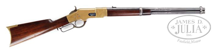 SCARCE HENRY MARKED WINCHESTER MODEL 1866 SADDLE RING CARBINE. SN 15574. Cal. 44 RF Henry. Early Henry marked carbine with 20″ rnd bbl, full magazine, integral front band/sight, early style 2-position flip rear sight and a staple & ring in left side of receiver. Mounted with uncheckered straight grain American walnut with straight stock & crescent rifle style brass buttplate with trap containing an orig 3-pc brass & iron wiping rod. Serial number is located on left side of bottom tang under the wood & has been partially obliterated but four of five numbers are mostly legible. Full serial number appears in top tang channel of buttstock & inside toe of buttplate. There were very few of the Henry marked ’66 carbines ever produced and extremely few of those survive today. They were very popular on the American frontier and usually saw hard daily service in all kinds of weather in both saddle scabbards and wagons with minimal maintenance. Therefore very few are found today in orig configuration with high orig finish. This is one of the finest ’66 carbines this cataloger has had the privilege to examine. CONDITION: Exceptionally fine. Bbl & magazine tube retain 85-90% strong bright orig blue with some slight muzzle wear & thinning & some cleaned rust on right side of bbl & magazine tube, otherwise it would be about 98%. Receiver & buttplate have very sharp, crisp edges & a wonderful, even, medium mustard patina. Screws in receiver retain most of their orig blue with some battering of timing screws. Lever retains traces of orig case colors with balance turned silver. Hammer retains about 90% of its bright orig case colors. Wood is sound with minor nicks & scratches and a small gouge on left side of butt & retains virtually all of its orig factory oil finish. Mechanics are crisp, brilliant shiny bore with a few scattered spots of pitting. 4-39673 JR153 (30,000-40,000)