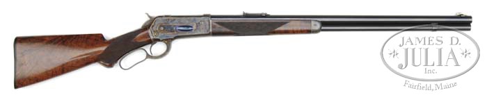 RARE SPECIAL ORDER DELUXE WINCHESTER MODEL 1886 LEVER ACTION RIFLE. SN 4100. Cal. 45-90. Rare deluxe ’86 with 26″ full matted rnd bbl, full magazine with German silver Rocky Mountain front sight & an unmarked 1886-style 1,000 yard ladder rear sight. Mounted with highly figured, center crotch, uncheckered American walnut with “H” style checkered forearm and serpentine pistol grip stock with black insert and full checkered hard rubber buttplate. Although this buttplate is not Winchester marked there is no doubt whatsoever that it is orig to this rifle. Left side of lower tang, under the wood, is stamped with the assembly number “2805”, “XXX”, “S” and “RB”. Matching assembly number is also found in the top tang channel of buttstock. Bbl address is on the top, forward of rear sight and was rolled through the matting. Caliber marking is on left side of chamber in order to accommodate the matting. Rifle is early style with spring screw that extends through the top tang. Accompanied by two Cody Firearms Museum letters, which are identical and identify this rifle in caliber 45-90 with rnd matted bbl, plain trigger, checkered stock with pistol grip, German silver Rocky Mountain front & sporting leaf rear sights, shotgun butt with rubber buttplate, received in warehouse Feb. 9, 1887 and shipped same day to Order #14698, returned & repaired Feb. 15, 1887. PROVENANCE: Wes Adams Estate Collection. CONDITION: Very fine. Bbl & magazine tube retain 96-97% strong orig blue with only light muzzle edge wear; receiver retains brilliant case colors on sides, lightly faded on right front and over the top with faint colors on belly; top tang is also fading; hammer retains bright case colors, faded on top edge; lever retains bright case colors on sides and in sheltered areas, fading to silver on outer front faces; wood is sound with a few, very minor nicks & scratches and one small rub on left side of buttstock with buttstock retaining 96-98% strong orig piano varnish; forearm retains about 75% strong orig piano varnish showing wear and turned dark on bottom rear edge. Mechanics are crisp, bright shiny bore. 4-44461 JR438 (30,000-50,000)