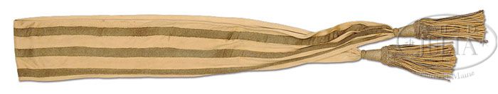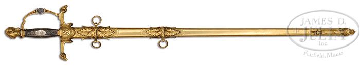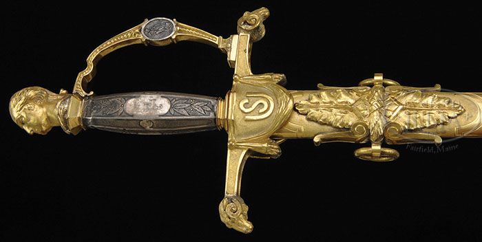 HIGH GRADE CASED TIFFANY PRESENTATION SWORD OF BRIG. GEN. HENRY W. BIRGE. This unusual and fine presentation sword represents among the finest of Tiffany workmanship. There are few examples known with a full figure bust of George Washington’s head which measures 2-1/2″ on pedestal as pommel. Knuckle bow has silver medallions of Hercules in raised relief and oval medallions on either side. The sheet silver grip is oct with engraved panels of laurel with plain oval panels for inscriptions. The 6-1/2″ cross guard has 2″ “draped” languets. Cross guard terminates in full figural ram’s heads. Scabbard has high relief florally decorated mounts. Drag is also florally decorated with a 4″ fasces in raised relief. Sword retains virtually all of its orig gold plating, which nicely highlight the silver grip and medallions. The blade is etched in typical high grade motifs typical of Tiffany with gold highlights and background. Fitted case also retains a General Officer’s gold sash with very unusual and high grade bouillon stripes. This is a beautiful cased Tiffany sword and sash that Gen. Birge must have proudly owned. Another high grade Tiffany sword is still retained by the family, which was presented by the 13th CT, Jan 1, 1864 as tribute for 1st unit entering Pt. Hudson upon its capture, is on display at the Leffingwell House Museum in Norwich, CT along with other arms. Gen. Birge was from a wealthy and important CT family, but this wealthy man was also a great fighter and from The History of Connecticut During the War by Croffutt & Morris, Gen. Birge in one anecdote concerning the Battle of Port Hudson. “First as Col, Birge he was in command of the Thirteenth regiment, Connecticut Volunteers. He was a strict, if not severe, disciplinarian, an accurate drill master, proud of his men, and possessed of a quick military mind. He especially enjoined neatness, cleanliness and martial bearing. Every belt, shoe and box must be neatly polished; every gun barrel and bayonet must shine like a mirror; every hand must wear a glove of spotless white; every form must be erect and manly.” Spectators commented “This regiment is composed only of rich men’s sons”. Birge replied “Well, I notice they didn’t run away like some of the dirty regiments”. Indeed Birge’s men were fighters having 50 causalities on April 14, 1863 at Irish Bend, LA and 23 additional causalities on June 14, 1862 at Port Hudson. At the beginning of the Civil War, Birge organized the first state regiment of CT. inf. in which he was originally appointed Maj. After service in MD and VA he was commissioned Col. of the 13th CT. Inf. in 1862 and was placed in command of the defenses in New Orleans. In Dec. of 1862, he was given command of a brigade which he retained during the first Red River Campaign and at the siege of Port Hudson. He was promoted to the rank of Brig. Gen. in 1863 and served in the 2nd Red River Campaign and subsequently commanded troops in Baton Rouge. In 1864 he was assigned to the command of the 2nd Div. of the 19th Army Corp and participated under Phil Sheridan in the Shenandoah Valley Campaigns. He was given command of the Defenses of Savannah in 1865 and his brigade fought in the Carolina’s Campaign under Sherman. On Feb. 25, 1865 Birge was awarded Brevet rank of Maj. Gen. PROVENANCE: Kevin Hoffman Collection. CONDITION: Overall very good to fine. 32-1/2″ dbl edge blade is bright with 19″ etched panels retaining much of there gold highlights with areas of staining and pitting as can be seen in photographs. Brass hilt, pommel, scabbard and mounts have scattered areas of staining, small scratches and dings retaining 95% of there orig gilt. Silver grip has several dents, especially at top as can be seen in photos. Silver medallions like grip have dark silver patina. The 43″ x 9-3/4″ x 3-3/4″ case is in very good overall condition with numerous small scrapes and scratches, but is sound with good hinges and locks. Blue velvet liner in box is sound and solid, coming unglued slightly on edges. The block to hold middle mount is loose and there are several tears in silk pillow liner on top. Even though casing is missing its presentation plaque; which has popped out, it still retains the 7-1/2″ x 3-1/2″ paper label on bottom of box which reads “H.W. Birge, Brig. Gen’l U.S.V., Norwich Conn.”. The 7′ long sash is 6″ wide with buff silk backing and striped bouillon facing is sound and solid as are knots. 4-46925 JS90 (65,000-75,000)