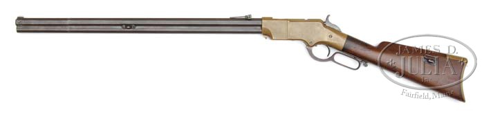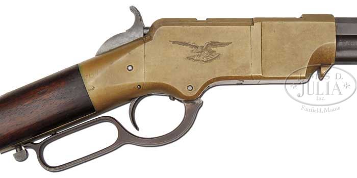 SCARCE EARLY MODEL 1860 HENRY RIFLE WITH BEAUTIFUL ENGRAVED EAGLE. SN 2556. Cal. 44 RF Henry. Standard early Henry rifle with 24-1/4″ oct bbl with integral magazine. It has slightly thinned German silver front sight and replacement 900 yard Henry ladder rear sight in the bbl dovetail with a second dovetail in top flat of receiver. Top flat of bbl has the 2-line Henry address forward of the rear sight and the SN over the chamber area. Receiver and first style round heel buttplate with trap are gun metal brass. Rifle is mounted with uncheckered straight grain buttstock with straight grip and has a factory sling swivel in left side with corresponding sling loop on left side of bbl. One screw of the sling loop on bbl is changed. SN is on left side of lower tang under the wood, inside top tang channel of buttstock and inside toe of buttplate. The rotating loading sleeve and top of bbl under the sleeve are marked with the matching assembly numbers “29”. The two buttplate screws are matching numbered to the rifle while the three tang screws are unnumbered although they are orig Henry screws. Left side of lower tang also has a small “W” (Oliver F. Winchester) inspector initial. Right sideplate is beautifully engraved with a spread-winged American eagle standing on an American shield. The work is not signed but it was most certainly accomplished by a very skilled engraver. PROVENANCE: Ex Herb Glass Sr. Coll. CONDITION: Fine. Bbl retains a smooth even plum patina with blue in the gullets showing a little bit of sharp edge wear and a couple of minor nicks. Receiver, sideplates & buttplate are a dark mustard patina with good sharp edges showing very little wear. Lever is a dark plum patina with the hammer showing dark case colors. Bolt shows strong dark blue through ejection port. Stock is sound with scattered use & handling nicks & dings and retains 85-90% strong orig varnish with some oil staining around the wrist. Mechanics are crisp, strong bore with sharp rifling and fine pitting. 4-40316 JR167 (17,500-27,500)
