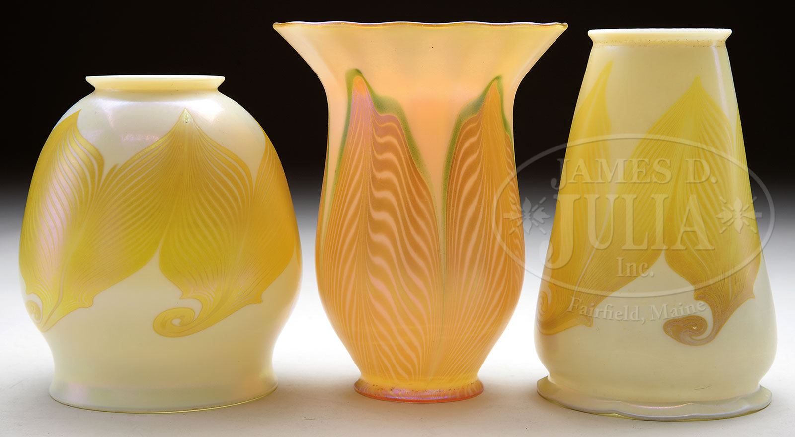 THREE QUEZAL ART GLASS SHADES. 1) Quezal shade has round body with yellow iridescent hooked feather design against a creamy white lightly iridescent background. Signed on the fitter “Quezal”. 2) Quezal shade has tall slender body with yellow to gold iridescent hooked feather design against a creamy white slightly iridescent background. Signed on the fitter “Quezal”. 3) Quezal shade has gold iridescent pulled feather design with green outline against a lightly ribbed creamy white background with light iridescence. Interior of the shade has bright gold iridescence. Signed on the fitter “Quezal”. SIZE: 1) 5″ t. 2) 5-7/8″ t. 3) 6″ t. All shades have 2-1/4″ fitter. CONDITION: All very good to excellent. 5-68094 (600-800)