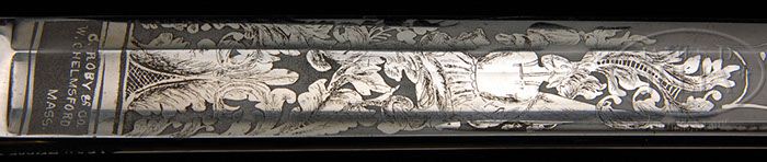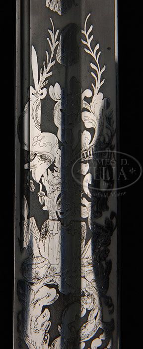 HIGH GRADE ROBY OFFICER’S SWORD TO CAPTAIN EDWARD FISKE, 30TH MASS VOLUNTEERS. This may be the finest and highest grade Christian Roby sword known. This sword is in wonderful condition retaining most all of its finish and plating along with unique features including MA. state seal cast in relief on top mount, spiral contrasting silver grip cast and chased to resemble sharkskin and unique pommel along with full blade and scabbard presentation. Edward Ambrose Fiske enlisted as a Private in Sept. 1861 at the age of 23, and five days after his enlistment he was elected 2nd Lt. He was then promoted to Capt. of CO. G on Oct. 21, 1862 and in Feb. 1865, he was brevetted to Maj. for gallant service at the Battle of Cedar Creek. The 30th MA. was a hard fighting unit having over 500 total casualties in its service is LA and VA. Fiske saw service at Baton Rouge, Port Hudson and the Sabine Pass along with other LA engagements. After LA, Fiske served under Brig. Gen. Henry Birge (who’s high grade presentation sword is being sold in previous lot) who wrote in his official report concerning Capt. Fiske at Battle of Cedar Creek where 127 men were killed or wounded and another 35 taken prisoner. “I am very greatly indebted for untiring attention to duties, performed with ability and good judgment, and bravery and action deserves special mention”. This is a fabulous sword that could never be upgraded to a real fighter from MA who served almost every day of the war. Capt. Fiske’s unit was the last Mass. Regiment to leave the service at war’s end. PROVENANCE: Kevin Hoffman Collection. Pictured on pages 350 & 351 in John H. Tillmann’s “Civil War Army Swords”. Sword is also pictured in an article in North South Trader’s Civil War magazine, Vol. 31. No. 1, 2005; pgs 52-53. CONDITION: Sword overall is in very fine condition. The 31-1/2″ blade is bright, retaining most of its orig shine. 17-1/2″ etched panels show the highest detail and fine decoration unique to the Roby artisan “Hoyt” who signed this blade on a flag in one of the Panoply of Arms. Brass scabbard, mounts, hilt and pommel retain 95% of there orig gold plate. Silver grip is fine including dbl strands of twisted, gold plated wire. Sword retains sword knot with blue and gold decoration which is very good to fine overall with fraying and wear to cord; bouillon knot is sound and complete. 4-46914 JS92 (20,000-30,000)