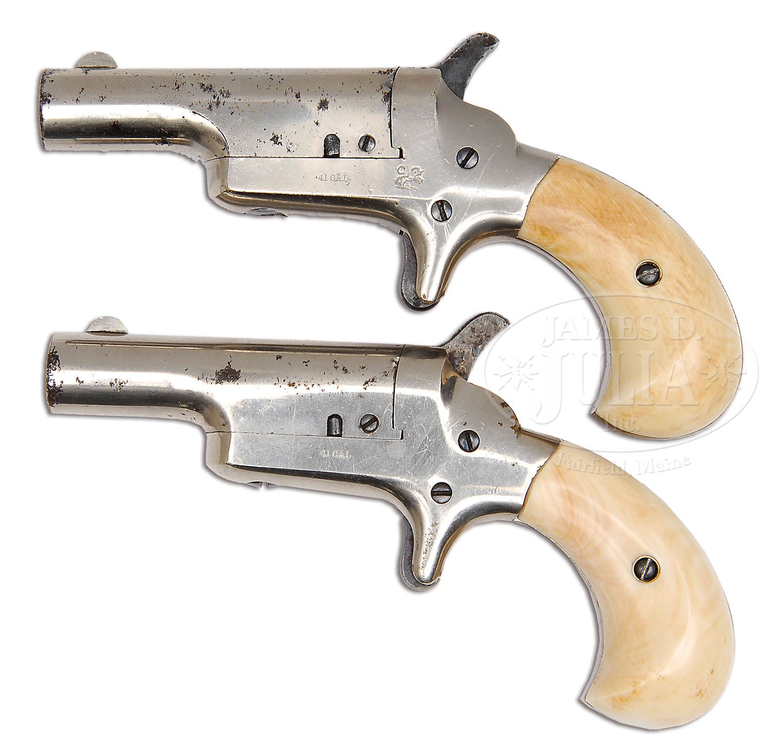 CASED COLT PAT. F.A. MFG. CO. 3RD MODEL DERINGER 5TH VARIATION. SN 36098 & 36209. Cal. .41 Short RF. Cased and sold in London at the Colt 14 Pall Mall store. They have the “C” and Rampant Colt which was Von Oppen’s stamp. Both guns are finished in full nickel with blued screws and case colored hammers and triggers. Fitted with factory ivory grips. PROVENANCE: L.D. Eberhart Collection. CONDITION: SN 36098: Finished in 100% nickel overall with fire blue screws and factory ivory grips. Piece is marked with Von Oppen and “C” Rampant Colt and “41 Cal.” on left hand side of frame. Frame retains 95% of orig nickel with only loss being a small amount from the backstrap area. Bbl retains 90% of orig nickel with 1 small, very minute pitted area close to the “C” in the “Colt” address on top of bbl and a few flaking areas around front sight. Trigger and hammer retain 90%+ of orig case colors.SN 36209: Has English proof marks as well as “41 Cal” in left side of frame is finished exactly as its mate but does not bear the Von Oppen Colt stamping. It appears to have been with this gun, as its mate since the beginning. Nickel frame retains nearly 100% of coverage and bbl retains 95% of orig nickel with only minor flaking at left muzzle portion and left upper bbl portion, from storage. Hammer and trigger retain 90% of bright case color. Fire blued screws retain most of their color. Both guns have factory ivory grips which have normal aging patina and are perfect in every respect with no chips and dings. English style, fancy casing is done in deluxe, diseased mahogany giving a magnificent grain to the top of lid. Interior is in nice condition and contains 2 orig, very rare, raised “E” headstamps made by Eley Bros. London, 41 cal. RF cartridges as well as 3 American made 41 cal. RF cartridges in other compartments. One compartment contains orig oil can and orig “L” shaped cleaning rod and turn screw. Lock is locked and no key is present. Tongue portion on upper lid has a missing section which allows case to close despite the lock being locked. On interior of top lid is orig Colt 14 Pall Mall paper label which is complete but does have oil stains and foxing due to age. Hinges are perfect. 2 ivory compartment pulls are perfect. Top of case bears a German silver, unadorned inlay shield. A nice English casing with excellent guns. 4-47464 DE84 (12,000-15,000)