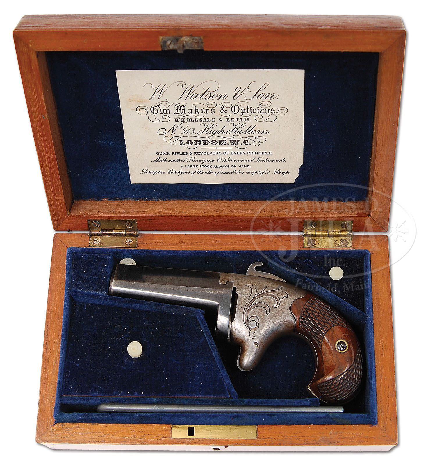 CASED COLT PAT. F.A. MFG. CO. 2ND MODEL DERINGER 2ND VARIATION. SN 7003. Cal. .41 Short RF. Cased in its orig Wm. WATSON & SON casing. Gun was in all likelihood purchased from the COLT agency at 14 PALL MALL. London and then resold through Watson. Orig, finish is silver plated frame with blued bbl and checkered walnut grips. PROVENANCE: L.D. Eberhart Collection. CONDITION: Gun, which was finished in blue bbl and silver plated frame is English proofed and retains 90%+ of orig blue on bbl with only wear on one side from storage. Gun has a case colored knife blade ejector with most of the case color intact. Case color on hammer and trigger are both 90% remaining. Iron frame has very nice gun metal gray patina with no pitting and is stamped “41 Cal” underneath bbl release button. Silver plate is still evident under grips but has long since flaked off from frame. Deluxe walnut grips have only storage marks and retain very sharp checkering and nearly 100% varnish. Fire blued screws , bbl retaining screw and grip screw are nearly perfect. Cased in orig “W. Watson & Son.” Casing having been cased by that company after purchase from Colt at 14 Pall Mall. Interior of case contains 12 of orig .41 short RF cartridges as well as orig ramrod combination tool, which retains most of its orig blue. Orig key within one of the storage compartments and works lock perfectly. All hinges are very sound. Finish on exterior of mahogany case is intact. Interior label is completely there having some staining with one small corner, no more than 5mm missing. A truly fine example in a wonderful casing which is all orig and extremely hard to improve upon. 4-47458 DE78 (14,000-17,500)