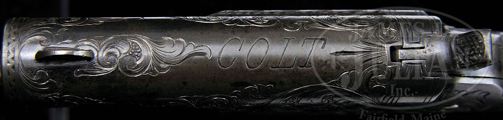 CASED MATCHED PAIR COLT PAT. F.A. MFG. CO. 3RD MODEL DERINGER 3RD VARIATION. SN 10101 & 11367. Cal. .41 Short RF. This matched pair was sold in England by Boss & Co,. 73 St. James St,. London. They are cased in their orig leather over wood casing with the orig oil can and turn screw. Both Deringers are Class C+ engraved and British proofed and fitted with fancy walnut grips. Cased pairs by this dealer are almost never seen. PROVENANCE: Norm Flayderman Collection, L.D. Eberhart Collection. CONDITION: SN 11367: Finished with blued bbls and silver frames, blue screws and case colored triggers and high hammers. Retains, in area where proof marks are on bottom of bbl very strong blue, fading overall to the top of bbl but has faded to a very nice, deep gun metal gray which does not detract from the gun. Silver plating on frame has 99% coverage. Case color on hammer and trigger are about 95%+ and all screws retain portions of the orig fire blue. The deluxe, striped walnut grips have only small storage marks and retain nearly 100% of orig varnish. SN 10101: Finished in same manner as its mate has 90%+ of orig blue, fading in some areas. Silver plate on frame is about 99% and blue screws still retain most of the fire blue and hammer and trigger are both 90%+ case color remaining. Grips are deluxe walnut with only light storage marks and retain nearly 100% of orig varnish. The very rare leather covered wood case that the guns were fitted to by Boss & Co. bears their label on the interior of the top lid affixed to the red blase which covers the entire interior. Guns are fitted in a most unusual way as evidenced by the pictures. There are ribbons under each gun to extract them from the casing. Interior of case contains: orig turn screw; 9 orig 41 short RF cartridges; orig “L” shaped cleaning rod and turn screw combination and pewter oil can. This is a unique, magnificent and very rare casing with super guns. Exterior of case has initials “J.B.G” in gold leaf on top lid. Some scuffing and dings over the years, but leather is sound. Leather hinge that holds lid on does have some cracking and damage but is still complete. At one time there was a strap present holding top tight but it is not present. The two keepers, one on front and one on back are present and complete with orig screws. 4-47462 DE82 (25,000-35,000)