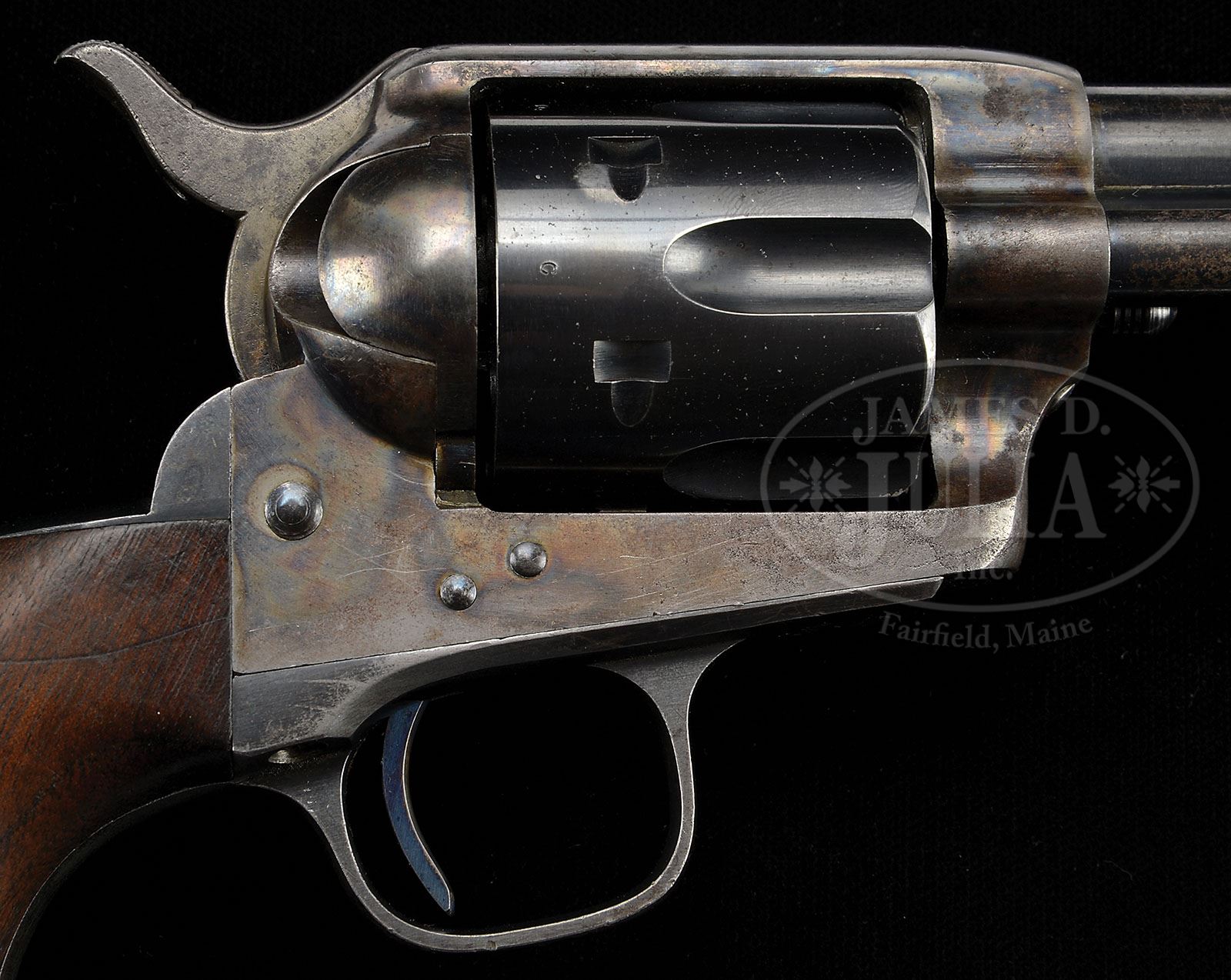 SCARCE CASEY INSPECTED COLT CAVALRY SINGLE ACTION ARMY REVOLVER. SN 16432. Cal. 45 Colt. Blue & color case hardened with 7-1/2″ bbl, full front sight and 1-line script letter address with serifs. Left side of frame has 2-line patent dates, the top line of which is extremely faint from a light strike. It also has a small “U.S.”. Ejector rod housing is first type with bull’s eye ejector rod head. Mounted with a 1-pc walnut grip that has last four digits of matching SN in back strap channel. Left side of grip has a legible “APC” (A.P. Casey) sub-inspector’s cartouche. Several of the revolver parts have a small “C” inspector initial. Mr. Casey’s inspection period ran from Dec. 1874 thru March 1875 and encompassed a rather small contract making Casey-inspected Colts substantially scarce. In most instances Casey-inspected single actions were issued to fighting cavalry regiments including the 2nd, 5th and 10th, in the American west fighting Indians, all of which were up and down the northern plains, Rocky Mountains and Southern plains from Montana to Texas. The 2nd Cavalry fought at the Battle of the Rosebud which immediately preceded Custer’s fiasco at the Little Big Horn. Few Casey inspected Cavalry Colts survive today in any condition. To find one completely orig with high orig finish is truly a great rarity. A majority of these revolvers were recalled in the 1890s and early 20th century and were altered to artillery configuration usually with mixed parts and bbls shortened to 5-1/2″. Apparently at one time an owner removed the orig 1-pc grip and replaced it with 2-pc grips as there is a grip locator pin hole in the front strap, now missing. Equally apparent the past owner retained the orig grip and eventually returned it to the revolver. According to our consignor, this is the earliest serial numbered Casey inspected Colt SSA, with #16433 being listed in John Kopec’s book as the earliest in his survey in Colt Cavalry & Artillery Revolvers. CONDITION: Very fine, all matching including bbl, cylinder & grip. Bbl retains about 95% strong orig blue with visible feathers on each side of the front sight; ejector housing retains about 90% strong orig blue with some flaking on outer radius; frame retains about 70% bright case colors with some fading on the sides; hammer retains faded case colors; cylinder retains 96-97% strong orig blue with only faint sharp edge wear and some minor nicks & flaking; grip frame retains about 90% strong orig blue with some candy striping on the front & back straps and trigger guard. Grip has chipped toes and a chipped left heel with some nicks & dings in the edges and retains a fine hand worn patina. Mechanics are crisp, bright shiny bore with a few small scattered spots of pitting. 4-49006 JR65 (25,000-45,000)