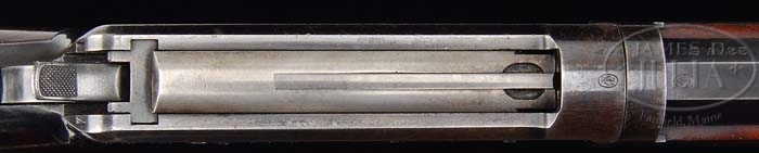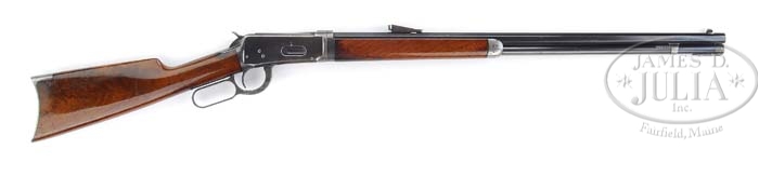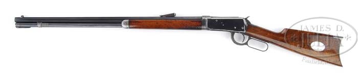 *RARE PRESENTATION WINCHESTER MODEL 1894 TAKEDOWN LEVER ACTION RIFLE WITH UNCHECKERED DELUXE WOOD. SN 324596. Cal. 32 WS. Standard grade rifle with 26″ oct bbl, half nickel front sight with screw and Winchester smokeless rear sight. Mounted with very highly figured, about 3X, uncheckered American walnut with straight stock & crescent steel buttplate. Wood, unusually, has piano varnish finish. Left side of the buttstock is inlaid with a nickel oval plate 2″ long x 1-1/4″ wide inscribed “JOHN S. WOOFTER”. Buttstock, under the buttplate, is stamped “1823”, no indication of the context of this number. Also under the buttplate is a hole like a hole for buttplate with trap. Just above and to the left of this hole is a small recess with a small diameter steel pin with a fingernail notch that appears to be the retainer for the presentation plaque. Accompanied by a Cody Firearms Museum letter which identifies this rifle, as found, having been shipped Jan. 8, 1907, returned & repaired Aug. 29, 1911. The letter incorrectly states his middle initial as “F” instead of the “S” that is on the stock on the plate. Left side of upper tang, under the wood, is stamped “JPP”. No other marks were observed. John S. Woofter was the Sheriff of Creek County, Oklahoma Territory, who lived in Sapulpa, a suburb of Tulsa today. Sheriff Woofter is mentioned as a party in a lawsuit involving the enforcement of state tax law that was argued before the Supreme Court of the United States in December 1918 which was decided in March 1919. Sheriff Woofter’s name was also mentioned in a legal brief concerning a prostitution case in which he was also involved in prosecuting. PROVENANCE: Pete Wall Collection; Bill Sisney Collection. CONDITION: Very fine. Bbl & magazine tube retain 93-95% strong orig blue with only sharp edge wear and some minor nicks & a few spots of pitting on right side. Forend cap is a cleaned metal patina. Receiver retains about 75% orig blue, strong & bright on sides with edge wear and bottom turning gray. Top tang is a blue/gray patina. Lever retains about 60% faded case colors and the hammer about 90% dark case colors. Wood is sound with minor nicks & scratches on buttstock and heavier creases on forearm with some dark oil staining at receiver end on the bottom. Buttstock retains about all of its strong orig piano varnish finish and the forearm about 75% of the same finish. Mechanics are crisp, bright shiny bore. 4-37401 (6,500-9,500)