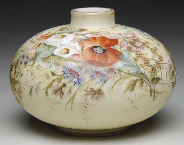 CROWN MILANO VASE. White opal glass with enameled decoration of flowers including poppies, wild roses, pansies and bell flowers with four gold enameled medallions including one with a griffin and cherub. Signed on underside with purple “CM” mark and numbered “606”. SIZE: 6-1/4″ dia x 5″ t. CONDITION: Very good with minor paint loss to one of the medallions. 5-62160 (400-600)