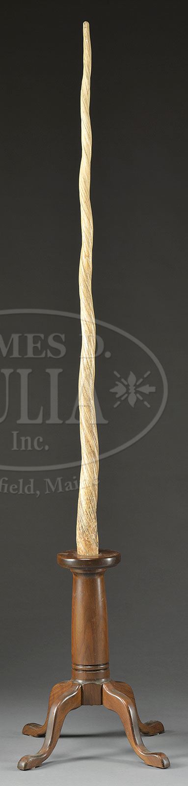 LARGE AND IMPORTANT NARWHAL TUSK ON STAND. This fine antique example with good color and patina mounted on a later pedestal stand raised on four legs. SIZE: Tusk: 61-1/2″ h. Overall: 84″ h. CONDITION: The tusk with age appropriate old vertical shrinkage cracks. Otherwise good. 9-29830 (5,000-8,000)