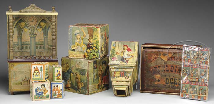 BUILDING BLOCK SETS AND PAPER ON WOOD TOYS. Lot includes fabulous paper on wood stackable blocks-complete set of 10. Possibly McLaughlin. Wooden box containing Cotton’s building blocks. Paper on wood ABC figural set in original box by Reed Chair Company. Paper on wood Trinity chimes set, keyboard plays church-like chimes (fading). 9 piece Mother Goose paper on wood train set. Other misc. block toys. SIZE: Chimes: 17″ h. PROVENANCE: Barbara J. Thornsjo Estate, Albion, Maine. CONDITION: Good unless otherwise stated above. 1-10753 (200-400) Auction: Advertising, Toy & Doll - Spring 2011 Please Note: All prices include the hammer price plus the buyer’s premium, which is paid by the buyer as part of the purchase price. The prices noted here after the auction are considered unofficial and do not become official until after the 46th day. |