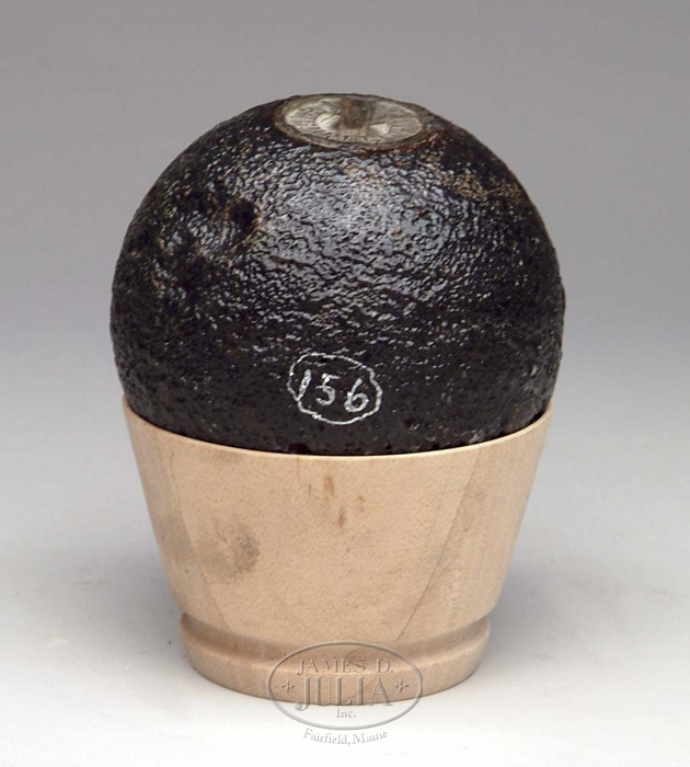 CS 12-POUNDER BORMANN FUSED CANNONBALL. Excavated. Cannon ball rests in a reproduction wooden sabot. Beautiful unpunched Confederate Bormann time-fuse. CONDITION: Slight to medium pitting. Opposite the fuse hole is a 1/4” hole where the shell was disarmed. 4-55806 JM3 (200-450)