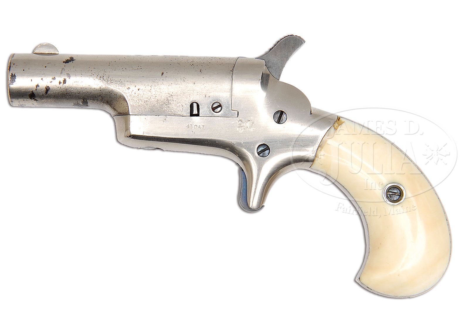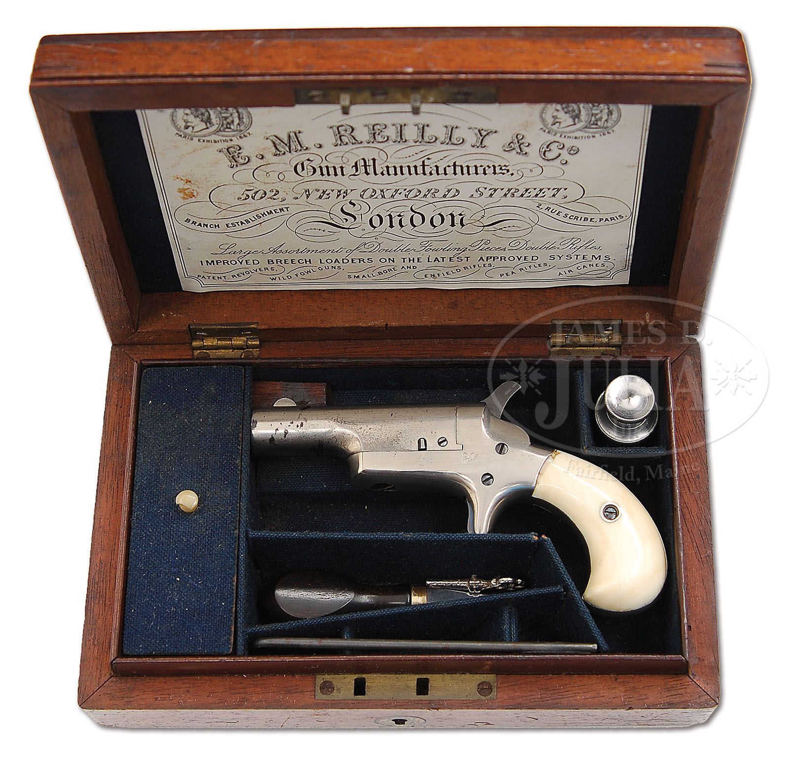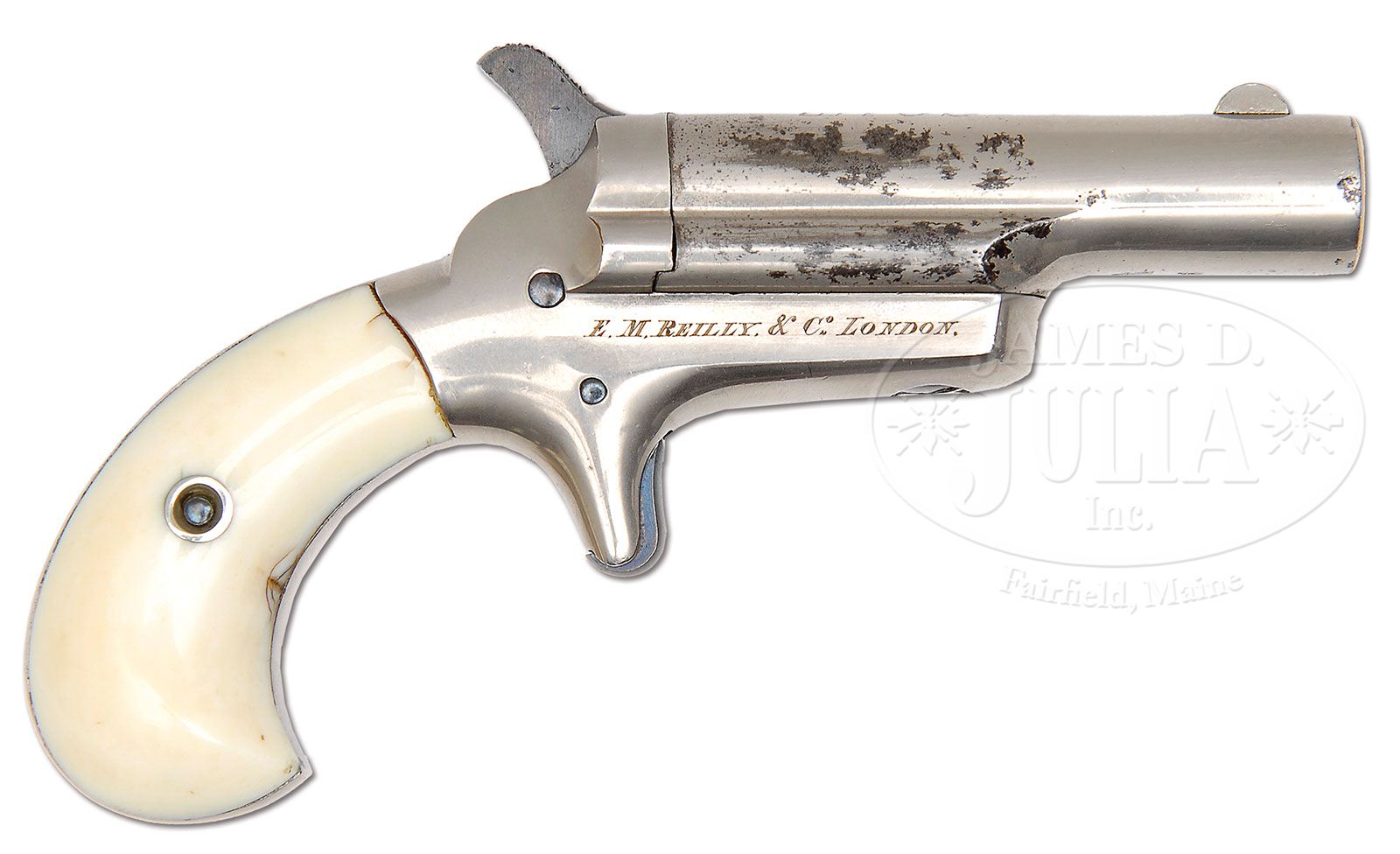 CASED COLT PAT. F.A. MFG. CO. 3RD MODEL DERINGER 5TH VARIATION. SN 39247. Cal. .41 Short RF. This 5th Variation has a “P” where the grip screw goes through the frame. Finished in 100% nickel with blued screws, hammer and trigger. Has factory ivory grips. Orig imported by Von Oppen and has the Rampant Colt & “C”. Probably sold by them to E.M.Reilly & Co. of London as it also has their dealership marking. Cased in rare single gun casing with also rare double dealership markings. PROVENANCE: L.D. Eberhart Collection. CONDITION: Gun is full nickel plate with nearly 100% remaining on frame with “41 Cal.” along with Rampant Colt and “C” on left hand side of frame. All fire blued screws retain most of their color as does the trigger. Bbl has about 80% of orig nickel still remaining with some losses through flaking showing dark patina in those areas. The engraved “E.M. Reilly” is nearly perfect and appears on right side of frame and is normal for this gun. Factory ivory grips are 95% have some chipping on left side where the top of grip meets frame. Hammer retains 85% strong case color. Factory casing is lined in blue blase and is totally there but contains 100+ years dust and some scraping from bbl sight and hammer spur. Orig label is complete on inside lid with some oil staining and foxing, but is otherwise as issued. Casing has orig oil can,turn screw and combination cleaning rod still in evidence along with key which does not work the lock. Also included are 5 old, 41 short RF cartridges. Ivory pull has a small piece missing. Case is a nice patina brown mahogany and has 10 brass screws around the outer edges of the top which is normal on most English style cases, however the shield shaped initial plaque on top of lid, we feel has been replaced with a later piece of brass. It has been there many years as it is tarnished almost black. This may have been removed by the orig owner to prevent someone from knowing they had sold the gun. A truly rare single casing by a well known English dealer. 4-47461 DE81 (4,500-6,500)