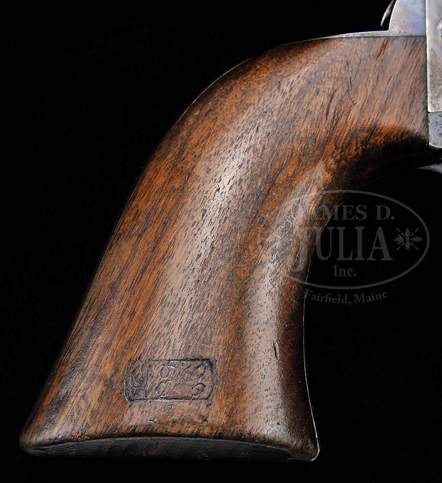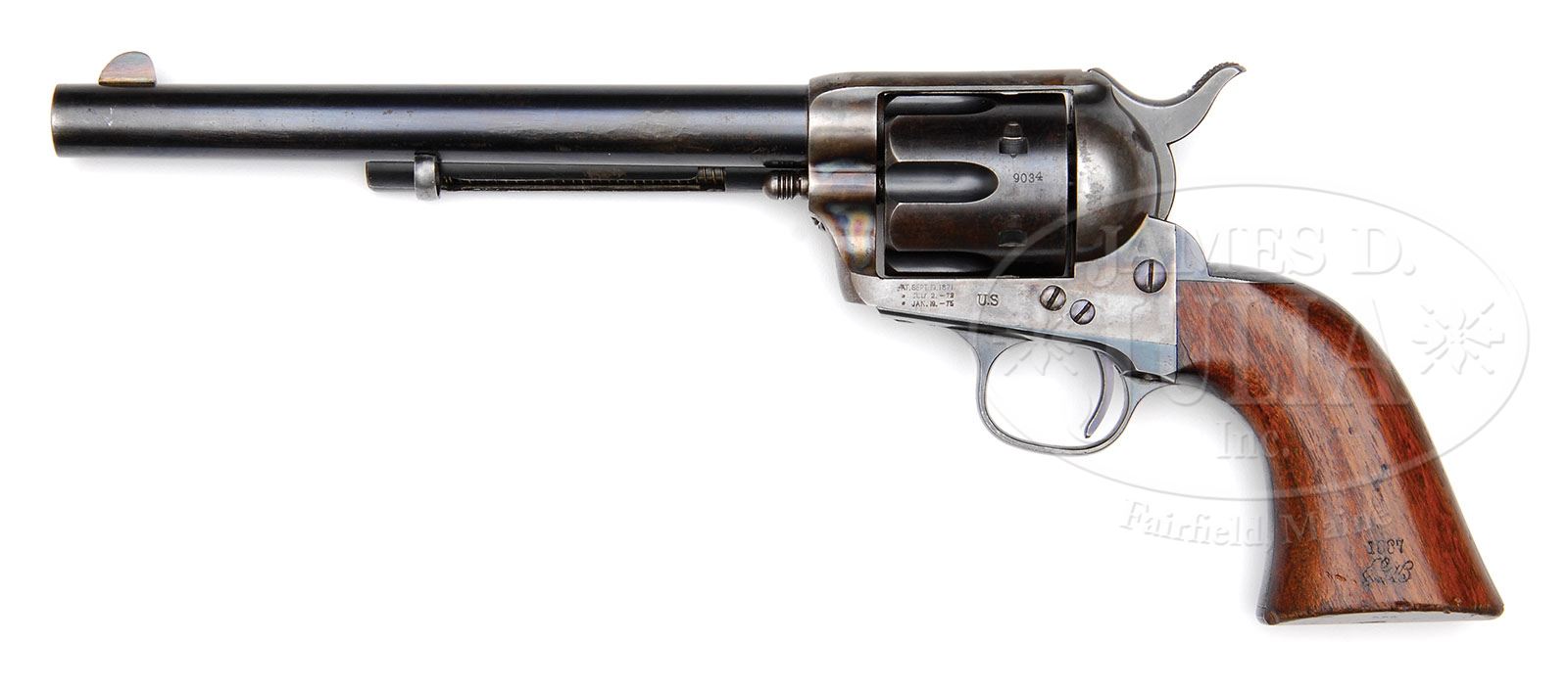 COLT CAVALRY SINGLE ACTION ARMY REVOLVER. SN 119034. Cal. 45 Colt. Blue & color case hardened with 7-1/2″ bbl, reattached full front sight and 1-line block letter address. Left side of the frame has 3-line patent dates and large “U.S”. Mounted with a 1-pc walnut grip that has last four digits of matching SN in back strap channel. Left side of the grip is marked with the “JGB” (Capt. John G. Butler) cartouche under the date “1887”. Right side of the grip bears the “DFC” (David F. Clark) sub-inspector cartouche. Bottom left edge of grip, bottom of bbl, bottom of the frame & cyl also have the “DFC” sub-inspector initials. Base pin is orig type with dimpled ends. In addition to the reattached front sight, both sides of the bbl have peened & dressed tool marks which areas have been artificially aged. This revolver was part of the 11th Contract which was signed Nov. 4, 1886 and completed in Feb. & March 1887. This revolver falls just before the listed serial range for the John G. Butler series as listed in Colt Cavalry and Artillery Revolvers…A Continuing Study, Kopec & Fenn, which lists the contract as being in the #119047 through #121238 range. CONDITION: Fine, all matching. Bbl retains about 75-80% glossy orig blue with the restoration as noted above; frame retains about 65-70% orig case colors, brilliant in the front gullets, moderately faded elsewhere and turning silver; hammer retains about 80% orig case colors; cyl retains most of an old restored finish with strong dark blue in the flutes, faded on the outer diameter to a blue/brown patina; trigger guard & back strap retain strong blue in sheltered areas, turning a little plummy on the front & back straps. Grip has a couple of chips in the edges, shows moderate edge wear with a few light nicks & scratches and retains most of its strong orig finish. Mechanics are fine, bright shiny bore. 4-48239 (20,000-25,000)