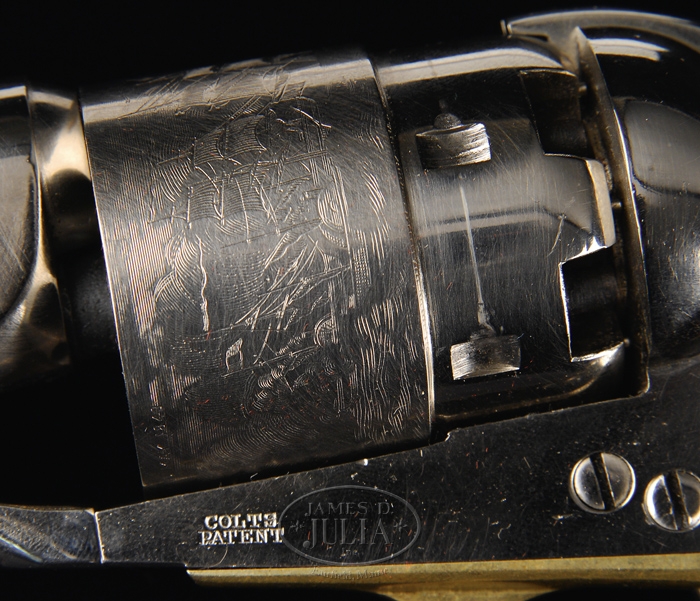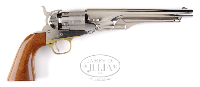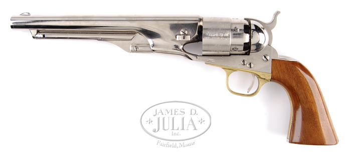 (Correction) Please note that the consignor corrects us and states that this gun has been re-done by Tommy Haas. FABULOUS COPY OF COLT 1860 ARMY REVOLVER. SN 99749. Cal. 44. With standard 8″ bbl, standard front sight, usual markings and cylinder of Naval scene. Gun has full nickel finish except for brass trigger guard. There is an “H” inspector mark at wedge screw, an “E” inspector mark on opposite side of bbl as well as on the cylinder, an “S” on bottom of bbl under rammer lever and “T” on top of backstrap. We can find no foreign proof marks, so we really can not determine the origin of this fine copy of a Colt 1860 Army. Mounted with fine 1-pc wooden grips. CONDITION: Very fine. Gun appears to be unfired with most all of its finish. There are a couple small pits on rammer handle that may be casting flaws. Cylinder has all of its safety pins and all the SN match. Bow of brass trigger guard has a few minor storage dings. Mechanics are crisp and bore is bright with left hand twist rifling. 4-32332 BT132 (1,500-3,000)