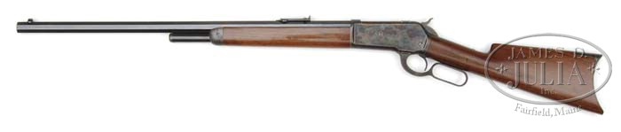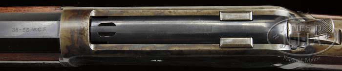 SCARCE EARLY SPECIAL ORDER WINCHESTER MODEL 1886 LEVER ACTION RIFLE. SN 23906. Cal. 38-56. Beautiful standard grade rifle with 26″ heavy oct bbl, half magazine (5-shots), ivory bead front sight and “1886” marked ladder rear sight. Mounted with uncheckered, straight grain American walnut with straight stock and crescent steel buttplate. Accompanied by a Cody Firearms Museum letter identifying this rifle in caliber 38-56 with oct bbl, plain trigger, 1/2 magazine (5 cartridges), sporting leaf & Lyman front sight, received in warehouse Sept. 27, 1888 and shipped same day to Order #12881. Standard grade Winchester rifles with high orig finish are quite unusual because they were often working man tools and usually saw hard service under adverse conditions with limited maintenance. PROVENANCE: Wes Adams Estate Collection. CONDITION: Extremely fine. Bbl & magazine tube retain about 98%+ condition with very faint sharp edge wear, a nick on the bbl and flaked magazine tube cap; receiver retains virtually all of its orig case colors, strong & bright on sides & top with the belly moderately faded but still showing the dbl shellac lines down the edges; lever & hammer retain most of their orig case colors, dark on top edge of hammer and moderately faded, turning silver on the loop; buttplate retains strong, bright case colors with wear only on edge of toe & heel; wood is sound with a few minor nicks & scratches and retains most of its orig varnish finish. Mechanics are crisp, bright shiny bore with some scattered roughness. 4-44497 JR433 (15,000-20,000)